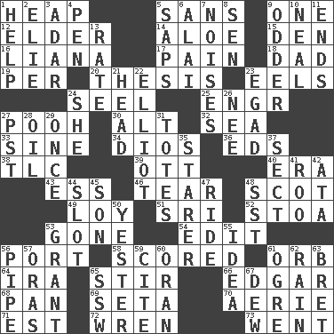 ACROSS 1. Pile 5. Without 9. Single 12. A person who is older than you are 14. _ vera 15. Lair 16. Woody, climbing, usually tropical plant 17. Ache 18. June honoree 19. For each 20. College paper 23. Snakelike fish 24. Stitch closed the eyes of (a falcon) 25. Engineer (abbr.) 27. "Silly old bear" 30. Keyboard modifier key 32. Ocean 33. Trig term 34. "Vaya con ____" 36. Begley and Asner 38. Affectionate concern, for short 39. Baseball player Mel 40. Period 43. Curvy letter 46. Separate forcefully 48. Native of Scotland 49. Myrna of the movies 51. Indian title of respect (Mr.) 52. Portico 53. Went 54. Prepare for publication 56. Sweet dark-red dessert wine 58. Tallied 61. Globe 64. Retirement account (abbr.) 65. Use a swizzle stick 66. _ Allan Poe 68. Baking dish 69. Bristle 70. Nest on high 71. Eastern Standard Time (abbr.) 72. Songbird 73. Left DOWN 1. Aid 2. Writer Wiesel 3. The sixth month of the Jewish calendar 4. Fenced enclosure 5. Plant excrements 6. Jai ____ 7. Annoying sounds 8. Elected rep. 9. More peculiar 10. Be tempered by heat 11. Conclusions 13. Assign a rank or rating to 21. Froth on beer 22. American author Paul (1891-1958) 23. Mild oath 24. A female animal or person 26. Born 27. Pacific Standard Time (abbr.) 28. Petroleum 29. At one time in the past 31. Hauls 35. A viewer who gazes fixedly 37. Religious group 41. Friend of Pooh 42. "One Day ___ Time" 44. Slit 45. Male child 47. Travel on or in a vehicle 48. Fast jet (abbr.) 50. Last 53. Let have 55. It may be bright or harebrained 56. Corncob 57. Mouths or openings 59. Quote 60. Northwest Algerian city 61. Legendary monster 62. Water falling in drops from the sky 63. Cy Young winner Saberhagen 65. Compass dir. 67. Morning condensation