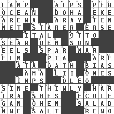 ACROSS 1. Desk light 5. High mountains 9. For each 12. Sea 14. Capital of the state of Qatar 15. Make supply last 16. Sports stadium 17. Like ___ of sunshine 18. "___ Little Indians" 19. Fish or hair follower 20. A viewer who gazes fixedly 23. Celtic language 24. Slanted text style (abbr.) 25. "Beetle Bailey" pooch 27. Shrivel 30. Lair 32. Boy, to dad 33. Snakelike fish 34. Coast Guard woman 36. Armed conflict 38. Shade tree 39. Parent Teacher Assoc. 40. "We ___ not amused" (Victoria) 43. _ moment's notice (2 wds.) 46. Pledge 48. Prejudice 49. Wet nurse (var.) 51. Cards in a Roman deck? 52. Singles 53. Naughty children 54. Butter sub 56. Trig term 58. Without force or sincere effort 61. Impair 64. Retirement account (abbr.) 65. "______ My Girl" (Turtles hit) 66. Learning spot: Fr. 68. Separate the seeds from cotton 69. Sign of things to come 70. First course 71. Compass dir. 72. Table seasoning 73. Western Nevada city DOWN 1. Grant temporary use of 2. 43,560 square feet 3. Confront 4. Baking dish 5. The sixth month of the Jewish calendar 6. Old wives' tales, e.g. 7. N Egypt peninsula 8. Declare 9. Stone: prefix 10. Makes supply last 11. French philosopher Descartes 13. Political cartoonist Thomas 21. Bits 22. City in Syria 23. Inactive volcano in Sicily 24. Big collection agency 26. Pull behind 27. Perceive with the eye 28. Snakelike fish 29. _ mater 31. Brizilian seaport 35. Food allowance for one day 37. Water falling in drops from the sky 41. Actress Charlotte 42. Double-curved letter 44. Not wild 45. Electrical Unit 47. Land elevation 48. Oct. 31 cry 50. Respiratory problem 53. Empty; void 55. Snake ____ (dice throw) 56. Signal 57. SW Asia republic 59. Person who is morally reprehensible 60. Is not 61. Undercover agent 62. Actor Alda or Thicke 63. Make new 65. Distress signal 67. 4-wheeled motor vehicle