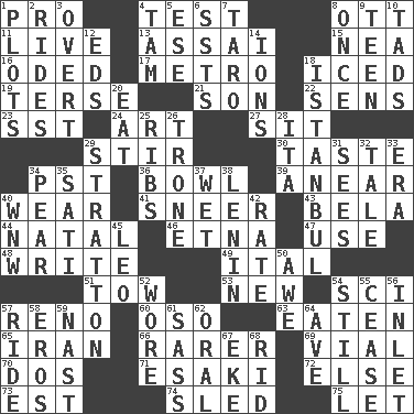 ACROSS 1. Adept person 4. Trial 8. Baseball player Mel 11. Moving, as bait 13. Slender Brazilian palm 15. Teachers' org. 16. Wrote a lyric poem 17. Paris' subway 18. On the rocks 19. Laconic 21. Boy, to dad 22. Elected reps. 23. Fast jet (abbr.) 24. Tate display 27. Be seated 29. Tumult 30. Clothes sense 34. Pacific Standard Time (abbr.) 36. Soup holder 39. Approach 40. Put on (as clothing) 41. Scornful expression 43. Actor Lugosi 44. Brizilian seaport 46. Inactive volcano in Sicily 47. Purpose 48. Compose 49. Slanted text style (abbr.) 51. Pull behind 53. ___ Haven, CT 54. _-fi 57. Western Nevada city 60. Bear (Spanish) 63. Eroded 65. SW Asia republic 66. Less widely known 69. Small bottle 70. Two (Sp.) 71. 1973 Nobel Price Winner (Physics) Leo 72. Otherwise 73. Eastern Standard Time (abbr.) 74. Downhill vehicle 75. Allow DOWN 1. Ground plans 2. Amusement-park features 3. Unconcealed 4. Scottish cap 5. Compass dir. 6. Fast planes 7. Pacific island yam 8. At one time in the past 9. Adolescent 10. Small amounts or degrees 12. Begley and Asner 14. Charged particles 18. Byzantium, centuries later 20. Erode 25. Chest bones 26. Heavy duty weighing machine 28. Call ___ day 29. Ski resort town in Vermont 31. Observes 32. Lie 33. Epoch 34. Lightbulb-shaped fruit 35. Suttee (variant) 37. Soggy 38. Soviet premier 1918-24 40. Compass dir. 42. Assign a rank or rating to 45. Lion 50. Deep reverence 52. Had on 54. Free from disturbance or agitation 55. Desist 56. An arm off of a larger body of water 57. Travel on an animal 58. Greek god of love 59. Political cartoonist Thomas 61. Backtalk 62. Relating to the mouth 64. "___ Maria" 67. Supplement with great effort 68. To free from