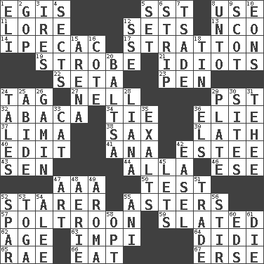 ACROSS 1. Armor plate that protects the chest 5. Fast jet (abbr.) 8. Purpose 11. Old wives' tales, e.g. 12. Arranges properly for use 13. Non-commissioned officer (abbr.) 14. Medicinal drug used to evoke vomiting 17. Ski resort town in Vermont 19. Disco prop 21. Foolish or stupid persons 22. Bristle 23. Animal enclosure 24. Label 27. 1994 drama film starring Jodie Foster 29. Pacific Standard Time (abbr.) 32. Phillipine bananalike plant 34. Neckwear 36. Writer Wiesel 37. Pale green bean 38. Saxophone 39. Thin strip of wood or metal 40. Prepare for publication 41. Santa ___, CA 42. First name in cosmetics 43. Elected rep. 44. Silent film actress Nazimova 46. Compass dir. 47. American Automobile Association (abbr.) 50. Trial 52. A viewer who gazes fixedly 55. Michaelmas daisies 57. Characterized by complete cowardliness 59. Scheduled 62. Personal question 63. Body of Kaffir warriors 64. "You Light Up My Life" star Conn 65. Actress Charlotte 66. Consume 67. Celtic language DOWN 1. Connecticut Ivy Leaguer 2. Grand Old Party 3. Angers 4. Religious groups 5. Arrange properly for use 6. Remove all contents or possession from 7. Sadhe (variant) 8. To (old English) 9. Native of Scotland 10. Immeasurably long periods of time 12. Compass dir. 15. Sports stadium 16. ____ d'Azur (French Riviera) 18. Shallow baking pan 20. Greek mezzo-soprano Agnes 24. Falsehoods 25. Remain 26. Street urchin 28. Woody, climbing, usually tropical plant 29. Food holder 30. Settings 31. Giggle 33. Feline 35. Glorifies 36. Raised railways 42. Artist's stand 45. Allows 47. Tate display 48. Nest on high 49. Odor 51. Swap 52. Coast Guard woman 53. Ancient Roman robe 54. Toward shelter 55. Black tropical American cuckoo 56. Use a swizzle stick 58. Elect 60. Begley and Asner 61. Expire