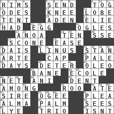 ACROSS 1. Basketball hoops 5. Post 9. Coat; cloak 12. Lyric poems 13. Leg joint 14. Ear part 15. Portable shelter 16. Arabian gulf 17. Writer Wiesel 18. Possessed 19. Ovum 21. Stares at amorously 22. Small Philippine buffalo 24. Nine, plus one 26. Compass dir. 27. Biscuitlike quick bread 28. Comfort 29. Raised platform 30. "_ and Lucy" (Charlie Brown theme song) 32. Comedian Laurel of Laurel & Hardy 36. Johnson of "Laugh-In" 37. Head covering 38. Diluted with white 39. 24-hour periods 40. Prevent from occurring 42. Butter sub 43. Object of repulsion 44. Learning spot: Fr. 46. Remaining after all deductions 49. Black tropical American cuckoo 50. Gouge 51. Amid 53. Friend of Pooh 54. Had dinner 57. Title for a man of rank and authority 58. Double curve, resembling the letter S 61. Entreaty 62. _ mater 63. Inside of hand 64. Observes 65. Potassium hydroxide 66. Musical group of three 67. Is not DOWN 1. Writer of Portnoy's Complaint (1969) 2. It may be bright or harebrained 3. Ananias' fault 4. Fast jet (abbr.) 5. Heroin 6. Conclusion 7. Born 8. Lair 9. For Whom the Bell _____ 10. Off-Broadway awards 11. Honkers 14. Part of a journey 19. Period of immesurable duration 20. Highlander 21. Single 23. Olfactory organs 24. Grayish beige 25. Curvy letter 27. "Two Mules for Sister ____" 28. Maternal 29. June honoree 31. Ancient Celtic tribe of eastern Britain 32. Soup utensil 33. Baron Munchausen's specialties 34. Toward shelter 35. Modern: prefix 40. Daniel's nick name 41. Make new 43. Paper or plastic container 45. Corporate head (abbr.) 46. Rhinal 47. Poet Dickinson 48. Singer Mel 52. Teachers' org. 53. San ____ (Riviera town) 55. Adolescent 56. Compass direction 58. Elect 59. Slender fish 60. Connecticut Ivy Leaguer 61. 23rd letter of the Greek alphabet