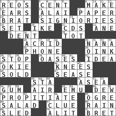 ACROSS 1. Vintage cars 5. Penny 9. Create 13. Hearing organs 14. Mountain range southwest of Kyrgyzstan 15. Some stationery 16. Naughty child 17. Seigniories (variant) 19. Arrange properly for use 20. Mamie's husband 21. Music discs 22. A saturated hydrocarbon 23. Undesirable depression on a surface 25. Small child 26. Bitter 30. Grandmother 34. Give a jingle 35. Pig sound 36. Close up, plug up 39. Fertile tracts in a desert 42. The main thing one is thinking about 43. Migrant worker of the '30s 44. Leg joints 46. Disposed of to a purchaser 47. Gospel singer Marvin 48. R.R. building 51. Toward the sea 54. Chewing product 57. Atmosphere 58. Australian flightless bird 60. Morning condensation 62. Appease 65. Legendary monster 66. First course 67. A slight indication 68. Precipitation 69. Downhill vehicle 70. Came down and settled, as after flight 71. Cy Young winner Saberhagen DOWN 1. Confederate soldiers (slang) 2. Having ears or earlike features 3. Speak pompously 4. Fast jet (abbr.) 5. Keg 6. Writer Wiesel 7. Tired old horse 8. Tinged 9. Spoil 10. Capital of Western Samoa 11. Peachy ____! 12. Celtic language 15. Mail 18. Wedding promise 20. Hankering 24. Slept 27. Friend of Pooh 28. _ tizzy (2 wds.) 29. Writing tables 30. Annoying sounds 31. Assist 32. Compass dir. 33. Alias (abbr.) 36. Mayday 37. Ring climax 38. Lubricate 40. Compass dir. 41. Ocean 45. He sold his birthright 48. Stated 49. Teat (slang) 50. N. Chile seaport 52. _ Allan Poe 53. Nest on high 54. Global Positioning Systems (abbr.) 55. Mountain range 56. Undercover agent 58. Needle holder 59. Rendezvous 61. Gone 63. Writing tablet 64. 100% 65. Globe