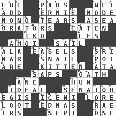 ACROSS 1. Enemy 4. Groovy apts. 8. Fish or hair follower 11. Say or write further 12. Bert's buddy 14. Thickened enlargement 15. Words to Nanette 17. Rends 18. At sea 19. Speakers 21. Ingested 23. Ring climax 24. French article 25. Mine, in Marseilles 27. Travel by water 30. In the manner of 31. Artist's stands 34. _ Lanka 37. Third mo. 38. Slow-paced one 39. Plant holder 40. "We ___ not amused" (Victoria) 41. Baby cat 43. "One Day ___ Time" 44. Plant excrements 45. Pledge 47. One (Scot) 49. Attila the _ 50. Standard of perfection 52. Legislator 56. The front part of a cuirass 57. Ancient Celtic tribe of eastern Britain 60. Old wives' tales, e.g. 61. Plunder 62. Ferber et al. 63. Actress Charlotte 64. Big collection agency 65. Back-to-school mo. 66. Order of Saint Francis (abbr.) DOWN 1. Papal veil 2. Aroma 3. Pulitzer Prize-winning author Ferber 4. Stone: prefix 5. Ancient Greek god of war 6. Heredity factor (abbr.) 7. Title for a knight 8. Olfactory organs 9. Paradise 10. Beverage made from leaves 13. Compass dir. 14. Nathan's nickname 16. Von Bismarck 20. Migrant worker of the '30s 22. Everything 25. Having or resembling wings 26. Female horse 27. Theater features 28. Came down and settled, as after flight 29. Small island 30. Wet nurse (var.) 32. "____ silly question..." 33. Clip 34. Petty quarrel 35. Writer of Portnoy's Complaint (1969) 36. Call ___ day 42. Part of speech 44. Ocean 46. Of or related to the anus 47. Goodbye (Sp.) 48. Egg locale 49. Robbery 50. Composer Stravinsky 51. Falsehood 52. Fastener 53. "Corrida" creature 54. Mouths or openings 55. Coral collection 56. Biblical high priest 58. Music discs 59. Compass dir.