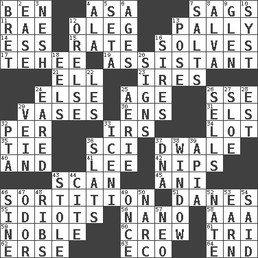 ACROSS 1. Benjamin's nick name 4. White ___ sheet 7. Settles 11. Actress Charlotte 12. Cassini of fashion 13. Friendly 14. Double-curved letter 15. Assign a rank or rating to 16. Finds the solution 17. Giggle 19. Aide 21. Pipe bend 23. Angers 24. Otherwise 25. Ripen 26. Compass dir. 29. Flower holders 30. Followers of ems 31. Raised railways 32. For each 33. Big collection agency 34. Car dealer's back yard 35. Make a knot 36. _-fi 37. A sleeping potion; an opiate (poet.) 40. Also 41. Area sheltered from the wind 42. Cuts off 43. Examine hastily 45. Black tropical American cuckoo 46. Making a chance decision by using lots 51. Natives or inhabitants of Denmark 55. Foolish or stupid persons 56. Billionth: prefix 58. American Automobile Association (abbr.) 59. Impressive in appearance 60. Ship's personnel 61. Three (prefix) 62. Celtic language 63. Environmental prefix 64. Conclusion DOWN 1. Cy Young winner Saberhagen 2. Comfort 3. Delicate 4. Chicken ___ king 5. Bristle 6. Grows older 7. Table seasonings 8. Inventor's middle name 9. Small, secluded valley 10. System (abbr.) 12. Threatening words 13. Airs 16. Male parents of animals 18. Snakelike fish 20. Attaches a signature 22. French article 24. Having ears or earlike features 25. Nest on high 26. Exchanges for money 27. _ gin 28. Eastern Standard Time (abbr.) 29. Distinctive style or manner 32. Parent Teacher Association (abbr.) 33. Ancient Celtic tribe of eastern Britain 36. Narrow boards 37. Heredity factor (abbr.) 38. Light entry point 39. Capital of Western Samoa 43. Fur scarf 44. Quote 46. Trig term 47. Scent 48. Teases 49. Single time 50. Drug cop 52. Nathan's nickname 53. Merit 54. Stated 57. Modern: prefix