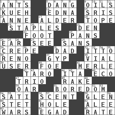 ACROSS 1. Pismires 5. Mild oath, euphamism for damn 9. Petroleums 13. Malaysian steamed pastry 14. Pulitzer Prize-winning author Ferber 15. Indian titles of respect 16. Queen of England 1702-14 17. Tree or shrub in the Birch family 18. Drink excessively 19. Paper fasteners 21. Lair 22. Pick up the tab 23. Zero-star reviews 24. Ewer handle 27. Observe 28. Without 29. Streamer paper 31. June honoree 32. "Tell ____ the Marines!" 36. Western Nevada city 37. Swindle 38. Small bottle 39. One who makes use of a thing 40. Enemy 41. Haggard of country music 42. Edible starchy tuberous root 44. Call ___ day 46. Environmental prefix 47. Musical group of three 48. Immoral or dissolute person 50. Boat paddle 51. Mood resulting from idleness 54. Suttee (variant) 56. Aroma 58. Small, secluded valley 60. Proofreading order 61. Hollow 62. Toward shelter 63. Armed conflicts 64. Mild oath 65. Assign a rank or rating to DOWN 1. Alias (abbr.) 2. Religious women 3. Portable shelter 4. Bundle of cut stalks of grain 5. Keyboard key 6. Sums up 7. Compass dir. 8. Slender fish 9. Clearly or manifestly demonstrative 10. Removes the wrinkles 11. Mouth edge 12. Compass dir. 17. _ vera 20. Introduce or present, as a question 21. One of the 12 tribes of Israel 23. Writing tablet 24. Shade of tan 25. Ancient Greek god of war 26. French philosopher Descartes 28. Plant excrement 30. Likenesses of persons 31. Color 33. Become fatigued 34. Baby powder 35. Butter sub 37. Thick or sticky substance 40. Back 41. Create 43. Atmosphere 44. Pressed 45. Small pie 47. Carrier 49. _ Allan Poe 51. Actor Lugosi 52. Spanish pot 53. Rendezvous 54. Compass dir. 55. "One Day ___ Time" 56. A female animal or person 57. Gear tooth 59. Born