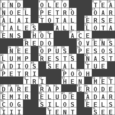 ACROSS 1. Conclude 4. Butter sub 8. Beverage made from leaves 11. Christmas carol 13. Stone: prefix 15. Rowing implement 16. Jai ____ 17. Add up to 18. Celtic language 19. Stories 21. 100% 22. Globular water bottle used in Asia 23. Followers of ems 24. Being at a high temperature 27. Adept person 29. Do over again 30. Baking chambers 34. Born 36. Musical composition 39. Mexican monetary units 40. Mass 41. Musical pauses 43. Political cartoonist Thomas 44. Goodbye (Sp.) 46. Lick closed 47. Third day of the wk. 48. _ dish (used to culture cells) 49. "Silly old bear" 51. Three (prefix) 53. Layer 54. Was introduced to 57. Have the gumption 60. Hit sharply and swiftly 63. Wear away 65. Independent ruler or chieftain 66. Dodge 69. The sixth month of the Jewish calendar 70. Gear tooth 71. Grain storage towers 72. Snakelike fish 73. One more than two 74. Portable shelter 75. Observe DOWN 1. Related on the mother's side 2. Pitcher Ryan 3. Allots cards 4. Choose 5. Lion 6. Singer James 7. Taken by mouth 8. "Corrida" creature 9. Compass direction 10. Type of rug 12. Falsehood 14. Spanish pot 18. Veterans Day date 20. A female animal or person 25. Aroma 26. Drinks excessively 28. Police officer (slang) 29. News announcer 31. Son of Isaac 32. Olfactory organ 33. Fast jet (abbr.) 34. Unadorned 35. Send forth 37. Purpose 38. Staphylococcus 40. Infant locale 42. A type of plum 45. Title for a knight 50. Single 52. Angers 54. Methods 55. Peak District village in England 56. Laconic 57. Tenth: prefix 58. Mine, in Marseilles 59. Swiss mountan, "Queen of the Mountains" 61. Came down and settled, as after flight 62. Whimper 64. Actress Charlotte 67. Spanish title 68. Eastern Standard Time (abbr.)