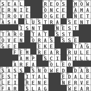ACROSS 1. Lick closed 5. Vintage cars 9. Cut the grass 12. Bert's buddy 14. At one time in the past 15. Nanny (var.) 16. Collection of objects 17. Double curve, resembling the letter S 18. Fish or hair follower 19. White ___ sheet 20. A period of five years 23. Emitted 24. Is not 25. A home for chicks 27. Edible starchy tuberous root 30. Make lace 32. Fast jet (abbr.) 33. Baking chamber 34. Mouths or openings 36. Compass dir. 38. Turn to the right 39. Make supply last 40. Label 43. Opposite of masc. 46. Bring up, as a child 48. Court order 49. Electrical Unit 51. _-fi 52. Land elevation 53. Type of rug 54. Butter sub 56. Backtalk 58. Overwhelmed 61. Pat or tap gently 64. Eastern Standard Time (abbr.) 65. Slanted text style (abbr.) 66. Peak District village in England 68. Luau accessory 69. French philosopher Descartes 70. Boldness 71. At a great distance 72. Volcanic refuse 73. Erode DOWN 1. Bristle 2. Blunders 3. Small Philippine buffalo 4. 54 in ancient Rome 5. Carrot, for example 6. Engineer (abbr.) 7. Seas 8. Observe 9. French painter Edouard 10. Sign of something about to happen 11. Electrical Unit 13. Snakelike fish 21. To (old English) 22. A viewer who gazes fixedly 23. Fast planes 24. Electrically charged atom 26. Double-curved letter 27. Coat; cloak 28. "___ Maria" 29. Coral collection 31. Receives possession of 35. Manatee 37. Needle holder 41. 100% 42. Set 44. Hearing organs 45. Madame (abbr.) 47. Cause heat under the collar 48. 17th letter of the Greek alphabet 50. Soft color 53. Being in motion 55. Locale of original sin 56. Itself 57. At sea 59. Grandmother 60. Cassini of fashion 61. Have the gumption 62. Inventor's middle name 63. Fermented drink made from hops 65. Big collection agency 67. Morning condensation