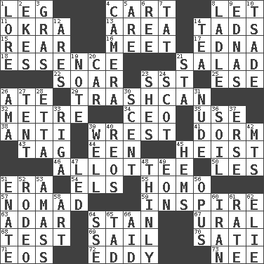 ACROSS 1. Part of a journey 4. Heavy open wagon 8. Allow 11. Gumbo ingredient 13. Type of rug 14. Small boys 15. Located in or toward the back 16. Rendezvous 17. Pulitzer Prize-winning author Ferber 18. Core 21. Vegetable dish 22. Fly high 23. Fast jet (abbr.) 25. Compass dir. 26. Had dinner 29. File 13 32. Distance measurement (Brit.) 34. Corporate head (abbr.) 35. Purpose 38. Opposed to 39. Take or capture by force 41. Dormintory (informal) 43. Label 44. Car or cant ending 45. Robbery 46. One to whom something is allotted 50. French article 51. Period 54. Raised railways 55. Like (prefix) 57. Wanderer 59. Motivate 63. The sixth month of the Jewish calendar 64. Comedian Laurel of Laurel & Hardy 67. Mountain range 68. Trial 69. Move on water 70. Suttee (variant) 71. Greek goddess of the dawn 72. Whirlpool 73. Born DOWN 1. Old wives' tales, e.g. 2. Supplements with great effort 3. Pate de foie ____ 4. Device for capturing images 5. "We ___ not amused" (Victoria) 6. To separate or throw off 7. Make lace 8. Dipping utensil 9. Ferber et al. 10. Sadhe (variant) 12. Ancient Greek god of war 14. Afternoon social gathering 19. Observe 20. Automobile 21. R.R. building 23. "______ My Girl" (Turtles hit) 24. Highlander 26. Wet nurse (var.) 27. Portable shelter 28. Singer James 30. Odor 31. Unadorned 33. Capital of Latvia 36. The visible part of the earth's surface 37. Celtic language 39. Not ill 40. Vintage cars 42. Mountains (abbr.) 45. Is hesitant and indecisive 47. Directed 48. Without force or sincere effort 49. A really long time 51. Related on the mother's side 52. Cowboy competition 53. Collect or gather 56. Musical composition 58. Nonscientific branch of learning 60. SW Asia republic 61. Pace 62. Writer Wiesel 64. Compass dir. 65. Bit 66. Help