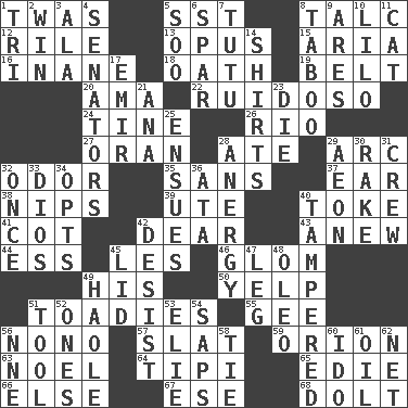 ACROSS 1. It was, poetically 5. Fast jet (abbr.) 8. Baby powder 12. Cause heat under the collar 13. Musical composition 15. Roberta Peters solo 16. Empty; void 18. Pledge 19. Waist strap 20. Nanny (var.) 22. Noisy, rowdy, vocal (Spanish) 24. Prong on a fork 26. River (Sp.) 27. Northwest Algerian city 28. Had dinner 29. Curve 32. Aroma 35. Without 37. Hearing organ 38. Cuts off 39. Shoshoni 40. Casino tip 41. Small bed 42. Letter starter 43. Afresh 44. Curvy letter 45. French article 46. Take by theft 49. Part of HMS, perhaps 50. Sharp bark 51. Sycophants 55. Unit of force equal to gravity 56. Words to Nanette 57. Narrow board 59. Greek mythologigal hunter 63. Christmas carol 64. Native american tent (variation) 65. Singer Brickell 66. Otherwise 67. Compass dir. 68. Stupid person DOWN 1. Three (prefix) 2. Victory 3. In the manner of 4. Legislators 5. "Barney Miller" actor Jack 6. Coast Guard woman 7. Ballerina skirt 8. Off limits 9. Ancient Greek god of war 10. _ and Stitch 11. Domesticated feline 14. Chest coverings 17. Arab leader 21. Santa ___, CA 23. Pass on 25. Takes place subsequently 28. Disorder of the immune system 29. A really long time 30. Libertine 31. Group working together 32. At one time in the past 33. "Vaya con ____" 34. Chooses 36. _ moment's notice (2 wds.) 40. ________ with (broke a safety seal) 42. Stop 45. Flaplike covering 47. Part of a journey 48. Margarine 49. White Person, in Hawaii 51. Implement 52. Washington bills 53. Writer Wiesel 54. Plant excrements 56. Compass dir. 58. Make a knot 60. Wedding promise 61. Petroleum 62. Remaining after all deductions