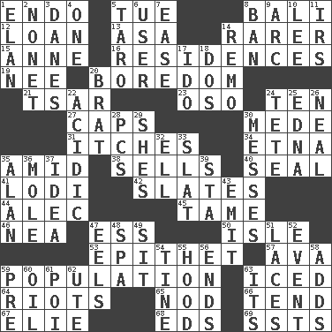ACROSS 1. Inside; within (prefix) 5. Third day of the wk. 8. Indonesian resort city 12. Grant temporary use of 13. White ___ sheet 14. More valued for its uncommonness 15. Queen of England 1702-14 16. Homes 19. Born 20. Mood resulting from idleness 21. Russian ruler of old 23. Bear (Spanish) 24. "___ Little Indians" 27. Smile enhancers 30. Ancient Persian 31. Strong, restless desires 34. Inactive volcano in Sicily 35. Among 38. Exchanges for money 40. Lick closed 41. Farming town in central California 42. Chalkboards 44. Actor Baldwin 45. Not wild 46. Teachers' org. 47. Double-curved letter 50. Small island 53. Curse 57. Actress Gardner 59. Census information 63. On the rocks 64. Debaucheries 65. Lower and raise head in agreement 66. Watch over 67. Writer Wiesel 68. Begley and Asner 69. Fast planes DOWN 1. Liveliness 2. Music written for nine 3. Natives or inhabitants of Denmark 4. Single 5. Pacific island yam 6. One who uses or employs something 7. Relaxation 8. Forbid 9. Curve 10. Area sheltered from the wind 11. Big collection agency 14. San ____ (Riviera town) 17. Wedding promise 18. Two (Sp.) 20. Naughty child 22. Being or containing an acid 24. False hair 25. Pulitzer Prize-winning author Ferber 26. Actress Patricia 28. Personal Computers (abbr.) 29. "______ My Girl" (Turtles hit) 30. Makes clutter 32. Pipe bend 33. Narrow board 35. Actor Alda or Thicke 36. Undercover agent 37. It may be bright or harebrained 39. R.R. building 43. Send forth 47. Snakelike fish 48. Health resort 49. Be seated 51. Shoestrings 52. Happening 54. Prong on a fork 55. Parka part 56. Conclusions 58. Does sums 59. Before (prefix) 60. Lubricate 61. Luau course 62. Shoshoni 63. It is