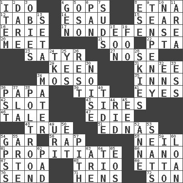 ACROSS 1. Wedding promise 4. Republicans 8. Inactive volcano in Sicily 12. Bar bills 14. Son of Isaac 15. Dry up 16. 4th largest of the Great Lakes 17. Unrelated to defense, as in spending 20. Rendezvous 21. "Barney Miller" actor Jack 22. Parent Teacher Association (abbr.) 23. Man with strong sexual desires 27. Olfactory organ 29. Peachy ____! 31. Leg joint 34. With motion or animation 35. Restaurants 36. Dad 39. Teat (slang) 41. Snake ____ (dice throw) 42. Position in a hierarchy or organization 43. Male parents of animals 46. Story 47. Singer Brickell 48. Loyal 51. Ferber et al. 54. Slender fish 56. Hit sharply and swiftly 58. Famous astronaut Armstrong 61. Appease 66. Billionth: prefix 67. Portico 68. Musical group of three 69. Singer James 70. Post 71. Coop moms 72. Male child DOWN 1. Detail 2. Have the gumption 3. Off-Broadway awards 4. Commissioned mil. rank 5. Bear (Spanish) 6. Baking dish 7. Soap bubbles 8. Compass dir. 9. 3-inch nail 10. Political cartoonist Thomas 11. Type of rug 13. Stalk of a moss capsule 18. Period of immesurable duration 19. Egg _ yung 24. Ring climax 25. It is so 26. Remainder 28. Atmospheres 30. Annoying sound 32. Compass dir. 33. Curvy letter 34. Mother 36. Pacific Standard Time (abbr.) 37. Wing 38. Characterized by complete cowardliness 40. Periodic rise and fall of the sea level 44. To free from 45. Car or cant ending 49. RI univ. 50. Erode 52. Queen of England 1702-14 53. Theater features 54. Global Positioning Systems (abbr.) 55. Johnson of "Laugh-In" 57. Essential or central part 59. To the inside or interior of 60. Grant temporary use of 62. Writing tablet 63. "We ___ not amused" (Victoria) 64. Shallow baking pan 65. Greek goddess of the dawn