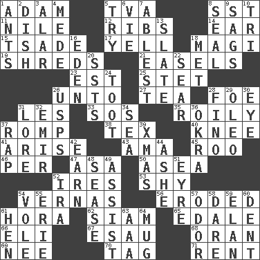 ACROSS 1. First man 5. Federal power corp. 8. Fast jet (abbr.) 11. Mediterranean tributary 12. Teases 14. Hearing organ 15. Sadhe (variant) 17. Shout 18. Wise men 19. Fragments 21. Artist's stands 23. Eastern Standard Time (abbr.) 25. Proofreading order 26. To (old English) 27. Beverage made from leaves 28. Enemy 31. French article 33. Distress signal 35. Turbulent 37. Play 38. John Ritter's dad 40. Leg joint 41. Ascend 43. Wet nurse (var.) 45. Friend of Pooh 46. For each 47. White ___ sheet 50. Toward the sea 52. Angers 53. Like a shrinking violet 54. Actresses Bloom and Felton 56. Eaten away 61. Israeli folk dance 62. Thailand, formerly 65. Peak District village in England 66. Connecticut Ivy Leaguer 67. Son of Isaac 68. Northwest Algerian city 69. Born 70. Label 71. Monthly bill DOWN 1. Pismires 2. Food container 3. Having or resembling wings 4. Ancient Persian 5. Attempt 6. Compete 7. Most capable 8. Lick closed 9. Sinks 10. Three (prefix) 13. Chalkboard 16. Paradise 18. Was introduced to 20. Fast planes 22. Burn superficially 24. A blast of a horn 26. United States Postal Service (abbr.) 28. Fine (Spanish) 29. Margarine 30. Sight organ 31. Old wives' tales, e.g. 32. Independent ruler or chieftain 34. Ocean 36. Gumbo ingredient 37. Reproach for some lapse or misdeed 39. Dec. holiday 42. Merit 44. American tennis player Robert 48. Gospel singer Marvin 49. Help 51. Jane of fiction 52. Retirement account (abbr.) 54. Grand slam 55. One of the Great Lakes 57. Scent 58. Have the gumption 59. Liveliness 60. Gouge 61. Layer 63. American Automobile Association (abbr.) 64. Large cup