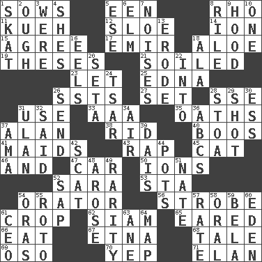 ACROSS 1. Sty mamas 5. Car or cant ending 8. 17th letter of the Greek alphabet 11. Malaysian steamed pastry 12. A type of plum 14. Electrically charged atom 15. Match 17. Arab leader 18. _ vera 19. College papers 21. Dirtied 23. Allow 25. Pulitzer Prize-winning author Ferber 26. Fast planes 27. Put into a specified state 28. Compass dir. 31. Purpose 33. American Automobile Association (abbr.) 35. Expletives 37. ____ Jay Lerner 38. To free from 40. Expressions of contempt or scorn 41. Women servants 43. Strike 45. Feline 46. Added to 47. Auto 50. Charged particles 52. "Two Mules for Sister ____" 53. R.R. building 54. Speaker 56. Disco prop 61. Riding implement 62. Thailand, formerly 65. Having ears or earlike features 66. Erode 67. Inactive volcano in Sicily 68. Lie 69. Bear (Spanish) 70. Slangy assent 71. Enthusiasm DOWN 1. Three-handed card game 2. Ending for "Through" and "Enough" 3. Past tense of be (plural) 4. "______ My Girl" (Turtles hit) 5. Compass dir. 6. Shade tree 7. Annoying sounds 8. Cause heat under the collar 9. Parka part 10. Single 13. Wear away 16. Snakelike fish 18. In the manner of 20. Bristle 22. To the inside or interior of 24. Russian ruler of old 26. Transmit 28. Portico 29. Attempt 30. Double-curved letter 31. Uhlan (variant) 32. Expressed in words 34. Wind 36. Lettered men learn these first 37. Housemaid (var.) 39. Raised platform 42. Go away! 44. Cooking vessels 48. Came up 49. Noteworthy scarcity 51. Nathan's nickname 52. Plant excrement 54. Mouths or openings 55. Printing process, for short 57. Assign a rank or rating to 58. Relating to the mouth 59. Actor Lugosi 60. Paradise 61. Corporate head (abbr.) 63. One (Scot) 64. Atlas unit