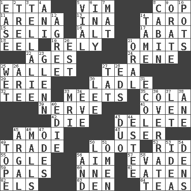 ACROSS 1. Singer James 5. Zeal 8. Police officer (slang) 11. Sports stadium 13. _ tizzy (2 wds.) 14. Edible starchy tuberous root 15. Major League Baseball Commissioner Bud 16. Keyboard modifier key 17. Blind as ____ 18. Snakelike fish 19. Have trust in 21. Leaves out 22. Eras 24. French philosopher Descartes 25. Place for singles 27. Afternoon social gathering 29. One of the Great Lakes 30. Dipping utensil 32. Adolescent 33. Confronts 35. Root beer relative 39. Impudent aggressiveness 41. Baking chamber 42. Pass on 43. Keyboard key 45. Mine, in Marseilles 48. One who uses or employs something 49. Barter 50. Spoils 52. To free from 55. Stare at amorously 56. Direct toward a target or goal 57. Elude 59. Friends 60. Compass dir. 61. Ingested 62. Raised railways 63. Lair 64. Afternoon social gatherings DOWN 1. Relaxation 2. Relationship diagram 3. Copy Pinocchio 4. Black tropical American cuckoo 5. Small bottle 6. Inwardly 7. Floor protector 8. Apartment or room in a ship 9. Declaim 10. Cooking vessels 12. Match 14. Not wild 20. Eastern Standard Time (abbr.) 21. Taken by mouth 23. American astronaut and politician John 25. Soggy 26. "We ___ not amused" (Victoria) 27. Make lace 28. Begley and Asner 30. Area sheltered from the wind 31. Learning spot: Fr. 33. Medical imaging device (abbr.) 34. Night before a holiday 36. Make much ado about nothing 37. Allow 38. A saturated hydrocarbon 40. Singer Brickell 43. Superhero pair 44. First name in cosmetics 45. Therefore, facetiously 46. Shopping centers 47. Lyric poems 49. Drink excessively 50. Actor's bit 51. Sign of something about to happen 53. The content of cognition 54. Hiding places for outlaws 56. Plus 58. Large container