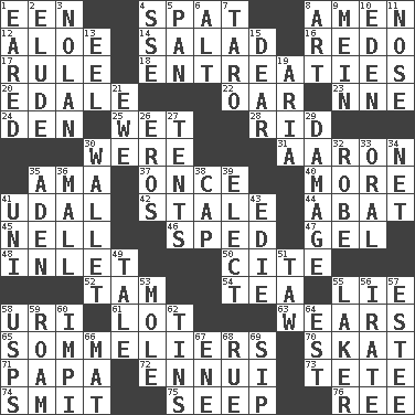 ACROSS 1. Car or cant ending 4. Petty quarrel 8. So be it 12. Medicinal plant 14. First course 16. Do over again 17. Governing power 18. Pleas 20. Peak District village in England 22. Rowing implement 23. Compass dir. 24. Lair 25. Soggy 28. To free from 30. Past tense of be (plural) 31. Composer Copland 35. Wet nurse (var.) 37. Single time 40. Greater amount 41. Allodial 42. Lacking originality or spontaneity 44. Blind as ____ 45. 1994 drama film starring Jodie Foster 46. Hurried 47. Set 48. An arm off of a larger body of water 50. Quote 52. Scottish cap 54. Beverage made from leaves 55. Untruth 58. RI univ. 61. Car dealer's back yard 63. Puts on (as clothing) 65. Wine waiters 70. Three-handed card game 71. Dad 72. World-weariness 73. Wig 74. Stricken, poetically 75. Ooze 76. To sift DOWN 1. Having ears or earlike features 2. Dodge 3. Pitcher Ryan 4. Compass dir. 5. Baking dish 6. Keyboard modifier key 7. Edible starchy tuberous root 8. Tate display 9. Count _ (2 wds.) 10. Paradise 11. Sense of smell 13. Snakelike fish 15. Letter starter 19. Roberta Peters solo 21. She-sheep 26. Greek god of love 27. Portable shelters 29. Break 30. Place for singles 32. Loose flowing garment 33. Relating to the mouth 34. Fish or hair follower 35. An important port of Yemen 36. Promenade 38. Head covering 39. Choose 41. University (slang) 43. Singer Brickell 49. Lie 51. The 23rd letter of the Hebrew alphabet 53. Undercover agent 55. Member of a famous L.A. basketball team 56. Feeling or showing extreme anger 57. First name in cosmetics 58. United States Postal Service (abbr.) 59. Wander aimlessly 60. Body of Kaffir warriors 62. Canisters 64. Eastern Standard Time (abbr.) 66. Floor protector 67. Compass dir. 68. Regret 69. Small drink