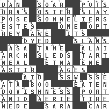 ACROSS 1. One of the 12 tribes of Israel 4. Fly high 8. Plant holders 12. Mouths or openings 14. Flexible twig of a willow tree 16. Kill 17. Introduce or present, as a question 18. Wine waiters 20. _____ Park, CO 22. Single 23. Choose 24. Marina Del _, California 25. Deep reverence 28. ___ a Wonderful Life 30. Colored 31. Criticizes harshly 35. White ___ sheet 37. Docile 40. Jai _ 41. Bowlike part 42. Bobsleighs 44. Small pie 45. Be tempered by heat 46. Inactive volcano in Sicily 47. Compass dir. 48. Having gotten out of bed 50. Eras 52. Help 54. Compass dir. 55. Compass dir. 58. _ moment's notice (2 wds.) 61. Oct. 31 cry 63. Eroded 65. Innocence, gentleness, or tenderness 70. Sweet dark-red dessert wine 71. Among 72. Nest on high 73. Hoop that covers a wheel 74. Ancient Persian 75. "Two Mules for Sister ____" 76. 4-wheeled motor vehicle DOWN 1. Drug addict 2. Came up 3. Difficult 4. Distress signal 5. Bear (Spanish) 6. Direct toward a target or goal 7. San ____ (Riviera town) 8. 23rd letter of the Greek alphabet 9. Margarine 10. Canvas cover 11. System (abbr.) 13. Perceive with the eye 15. Painter Guido (1575-1642) 19. Allows 21. Declare 26. Soaks 27. Peak District village in England 29. Chalkboards 30. A pale violet or amethyst color 32. ____ Jay Lerner 33. Female horse 34. Be seated 35. Ancient Greek god of war 36. Go away! 38. Was introduced to 39. Ferber et al. 41. Santa ___, CA 43. Settles 49. Teases 51. She-sheep 53. Capital of the state of Qatar 55. Unemotional 56. Spanish missionary in California 57. Keyboard key 58. First of billions? 59. Heavy book 60. Enthusiastic 62. Singles 64. Fitting 66. Binary compound 67. Epoch 68. Title for a knight 69. Ocean