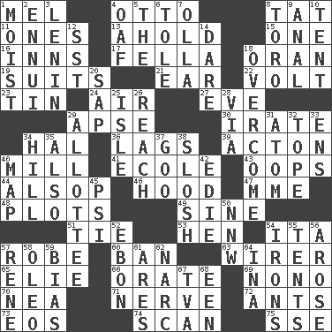 ACROSS 1. Cartoonist voice _ Blanc 4. Von Bismarck 8. Make lace 11. Singles 13. Hold, grip (Informal) 15. Single 16. Restaurants 17. Man or boy (slang) 18. NW Algerian seaport 19. Costumes for special activities 21. Ewer handle 22. Electrical Unit 23. Shallow baking pan 24. Atmosphere 27. Night before a holiday 29. Domed church section 30. Feeling or showing extreme anger 34. Actor Linden 36. Fails to keep up a pace 39. Gambison 40. Place where flour is made 41. Learning spot: Fr. 43. I made a mistake 44. Columnist Joseph or Stewart 46. Parka part 47. Madame (abbr.) 48. Ground plans 49. Trig term 51. Make a knot 53. Layer 54. Call ___ day 57. Loose flowing garment 60. Bar 63. One who wires 65. Writer Wiesel 66. Declaim 69. Words to Nanette 70. Teachers' org. 71. Boldness 72. Pismires 73. Greek goddess of the dawn 74. Skim 75. Compass dir. DOWN 1. Damp 2. World-weariness 3. Soviet premier 1918-24 4. Clumsy lout 5. Definite Article 6. Lacquered or enameled metalware 7. Spanish pot 8. "Corrida" creature 9. Of or related to the anus 10. Portable shelter 12. Fast jet (abbr.) 14. Have the gumption 18. Conquer 20. Plant excrement 25. Capri or Wight 26. Arrive at 28. By way of 29. One to whom something is allotted 31. Smallest unit of an element 32. Drink excessively 33. Followers of ems 34. Land elevation 35. In addition 37. Thick or sticky substance 38. Agitate, as a liquid 40. Atlas unit 42. Singer Brickell 45. Air pressure measure (abbr.) 50. Compass dir. 52. Inky black, to poets 54. Metal shackles 55. Portable shelters 56. Came up 57. French philosopher Descartes 58. Margarine 59. Prejudice 61. Ancient Greek god of war 62. Drug cop 64. _ tizzy (2 wds.) 67. Federal power corp. 68. Car or cant ending