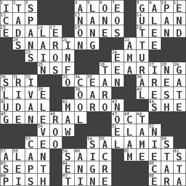 ACROSS 1. ___ a Wonderful Life 4. _ vera 8. Stare wonderingly 12. Head covering 13. Billionth: prefix 14. Uhlan (variant) 15. Peak District village in England 18. Singles 19. Look after 20. Catching in a trap 22. Had dinner 23. The Jewish people; Israel 24. Australian flightless bird 25. Science/research agcy. 26. Pulling into pieces 30. _ Lanka 33. Sea 36. Type of rug 37. Not recorded 39. Boat paddle 40. For fear that 41. Allodial 42. Person of subnormal intelligence 44. A female animal or person 45. Commissioned military rank 47. Sep. follower 50. Promise 51. Flair 53. Corporate head (abbr.) 54. Deli grouping 57. Actor Alda or Thicke 59. Ketch in the Levant 61. Confronts 63. Back-to-school mo. 64. Engineer (abbr.) 65. Domesticated feline 66. Expression of disdain 67. Prong on a fork 68. Period DOWN 1. Frozen water 2. Small boys 3. Connects, as a bridge 4. At once, immediately (arch.) 5. Long (Scottish) 6. Single 7. Greek goddess of the dawn 8. From the throat 9. Toward shelter 10. Baking dish 11. Conclude 16. (Had) reclined 17. Greek god of love 21. Information 22. Nanny (var.) 24. Car or cant ending 26. Edible starchy tuberous root 27. Angers 28. Tender 29. Yard entry 30. A hard, heavy blow 31. Travel on or in a vehicle 32. "Terrible" tsar 34. Calm and collected 35. Ewer handle 38. Veterans Day date 42. Opening into something insatiable 43. Christmas carol 46. Friend of Pooh 48. Dollar (slang) 49. Not wild 52. Sibling's daughter 53. Smile enhancers 54. Public display of a written message 55. Land measure 56. Play the lead 57. Cleo's killer 58. Luau accessory 59. Arrange properly for use 60. Black tropical American cuckoo 62. R.R. building