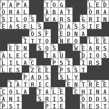 ACROSS 1. Dad 5. Coat; cloak 8. Directed 11. Of the mouth 12. Blind as ____ 14. Mouth or opening 15. Grain storage towers 17. Armed conflicts 18. Amused look 19. Artist's stands 21. Hyrax 23. Order of Saint Francis (abbr.) 25. Pulitzer Prize-winning author Ferber 26. "Tell ____ the Marines!" 27. Modern: prefix 28. Area sheltered from the wind 31. Car or cant ending 33. Mayday 35. Puts on (as clothing) 37. Actor Baldwin 38. The 19th letter of the Greek alphabet 40. "Vaya con ____" 41. Pale purple color 43. Air pressure measure (abbr.) 45. Big collection agency 46. French article 47. Last letter of the English alphabet 50. Inconspicuous attention getter 52. Writing tablets 53. Mischievous 54. Of or pertaining to medicine 56. Main course 61. Root beer relative 62. Falsehood 65. Large country 66. Black tropical American cuckoo 67. Indian titles of respect 68. Likelihood 69. Pacific Standard Time (abbr.) 70. Sliced dessert 71. State of inaction DOWN 1. Airs 2. Roberta Peters solo 3. Friends 4. Medicinal plant 5. The 23rd letter of the Hebrew alphabet 6. Chief or king in Benin or Nigeria 7. Place where plants grow 8. Australian parrot (variant) 9. One of the Great Lakes 10. One of the 12 tribes of Israel 13. Sadhe (variant) 16. Groove 18. Girls' org. (abbr.) 20. Fast planes 22. Frozen precipitation 24. Lowest support of a structure 26. South American Indian 28. Den 29. Greek god of love 30. Double-curved letter 31. Writer Wiesel 32. Snakelike fish 34. Plant excrement 36. Prepare for publication 37. 100% 39. United States Postal Service (abbr.) 42. Russian ruler of old 44. Small island 48. Proofreads 49. Fortification 51. Synchronize (abbr.) 52. Parent Teacher Assoc. 54. Charged atoms 55. Set down 57. Son of Odin 58. Travel on an animal 59. Extremities 60. Compass direction 61. Head covering 63. Cards in a Roman deck? 64. Compass dir.