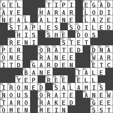 ACROSS 1. Set 4. Native american tent (variation) 8. Mild oath 12. "___ Maria" 13. Ethiopian city, capital of Harari 14. Farming town in central California 15. Anneal 17. Place in a line 18. Goldbrick 19. Paper fasteners 21. Dirtied 23. Part of HMS, perhaps 24. A female animal or person 26. Two (Sp.) 27. Painter Guido (1575-1642) 28. Proofreading order 30. For each 31. Declaimed 34. Heredity factor (abbr.) 37. Single 38. Indian princess (variant) 39. Armed conflict 40. It would 41. Place where plants grow 42. And so on (abbr.) 43. Object of repulsion 44. Falsehood 46. Slangy assent 47. To riddle 50. Pipe bend 51. Pressed 54. Deli grouping 57. Horse sense 58. Declaim 60. Afresh 62. Edible starchy tuberous root 63. Moved through 64. Turn to the right 65. Sign of things to come 66. Count _ (2 wds.) 67. Fast jet (abbr.) DOWN 1. Separate the seeds from cotton 2. Nights before holidays 3. Resembling or made to resemble leather 4. Lies 5. From or relating to Ireland 6. Baking dish 7. Angers 8. American author Paul (1891-1958) 9. Scores awarded for successful feats 10. Edge tool used to cut and shape wood 11. Passed on 13. Actor Linden 16. (Had) reclined 20. Air pressure measure (abbr.) 22. Wrote a lyric poem 25. First name in cosmetics 27. Monthly bill 29. Adolescent 30. Luau course 31. Northwest Algerian city 32. Less widely known 33. Added to 34. Homes 35. Nathan's nickname 36. Curve 41. Stare wonderingly 43. Gillaume's butler role 44. Beverage made from leaves 45. _ mater 46. You are 48. 1973 Nobel Price Winner (Physics) Leo 49. Ingested 51. To the inside or interior of 52. Wander 53. Dormintory (informal) 55. Directed 56. Observes 59. Actress Charlotte 61. Dripping