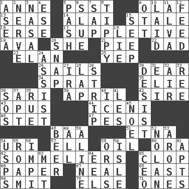 ACROSS 1. Queen of England 1702-14 5. Inconspicuous attention getter 9. Norwegian king 13. Oceans 14. Jai _ 15. Having lost freshness 16. Celtic language 17. Supplementary 19. Actress Gardner 20. A female animal or person 21. Sliced dessert 22. Male parent 23. Enthusiasm 25. Slangy assent 26. Moves on water 30. Letter starter 34. Small fatty European fish 35. Writer Wiesel 36. Indian skirt 39. Showery time 42. Beget 43. Musical composition 44. Ancient Celtic tribe of eastern Britain 46. Proofreading order 47. Mexican monetary units 48. Sound made by sheep 51. Inactive volcano in Sicily 54. RI univ. 57. Pipe bend 58. Lubricate 60. Mouth or opening 62. Wine waiters 65. Hoof sound 66. Some stationery 67. Actress Patricia 68. Compass direction 69. Stricken, poetically 70. Otherwise 71. Washington bills DOWN 1. At sea 2. Boldness 3. Relating to the nose 4. Compass dir. 5. Romantic infatuation 6. Turn sharply 7. Plant excrement 8. Likely to tip or tilt 9. Baseball player Mel 10. Put down 11. Inventor's middle name 12. Nourish 15. Ooze 18. Untruth 20. Fastener 24. Aid 27. Retirement account (abbr.) 28. Infant locale 29. Long narrow piece of something 30. Cease 31. Biblical high priest 32. Atmosphere 33. To sift 36. Distress signal 37. Fitting 38. Regret 40. Frozen water 41. French article 45. Christmas carol 48. Fermented drink made from hops 49. 100% 50. Place in a line 52. Pitcher Ryan 53. Came up 54. United States Postal Service (abbr.) 55. Wander 56. Body of Kaffir warriors 58. Mouths or openings 59. Capri or Wight 61. Flats, for short 63. Was introduced to 64. Snakelike fish 65. Corporate head (abbr.)