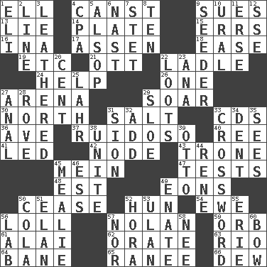 ACROSS 1. Pipe bend 4. 2nd pers. sing. pres. of can (arch.) 9. Institutes legal proceedings 13. Whopper 14. Food holder 15. Blunders 16. _ tizzy (2 wds.) 17. NE Netherlands city 18. Relaxation 19. And so on (abbr.) 21. Baseball player Mel 22. Dipping utensil 24. Assist 26. Single 27. Sports stadium 29. Fly high 30. _ pole 31. Table seasoning 33. Music discs 36. "___ Maria" 37. Boisterous (Brazilian Portuguese) 40. To sift 41. Directed 42. Connecting point 43. Marketplace scale 45. Count _ (2 wds.) 47. Trials 48. Eastern Standard Time (abbr.) 49. Immeasurably long periods of time 50. Stop 52. Attila the _ 54. She-sheep 56. Hang loosely or laxly 57. Pitcher Ryan 59. Globe 61. Jai _ 62. Speak pompously 63. River (Sp.) 64. Object of repulsion 65. The wife of a rajah (variant) 66. Morning condensation DOWN 1. Biblical high priest 2. Actor's bit 3. Tough but pliablecoriaceous 4. Accounting whiz (abbr.) 5. Columnist Joseph or Stewart 6. Political cartoonist Thomas 7. Proofreading order 8. Nine, plus one 9. Sowing specialist 10. Mountain range 11. Celtic language 12. Compass dir. 20. Penny 22. Plunders 23. Santa ___, CA 25. Cowardly lion portrayer 27. Of or related to the anus 28. Be footloose 29. A type of plum 31. The Jewish people; Israel 32. Find the sum of 33. What you're doing now 34. Gouge 35. Perceives with the eye 38. Join together 39. Von Bismarck 44. French philosopher Descartes 45. Ear of corn 46. Curvy letter 49. Maternal 50. Root beer relative 51. Style 52. Israeli folk dance 53. ____ Bator, Mongolia 55. 4th largest of the Great Lakes 56. Experiment locale 57. Not either 58. Born 60. Arrow shooter