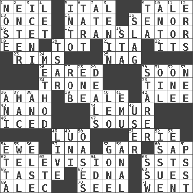ACROSS 1. Famous astronaut Armstrong 5. Slanted text style (abbr.) 9. Falsehood 13. Single time 14. Nathan's nickname 15. Sir (Sp.) 16. Proofreading order 17. Interpreter 19. Car or cant ending 20. Small child 21. Call ___ day 22. It is 23. Basketball hoops 25. Tired old horse 26. Having ears or earlike features 30. Within a short period 34. Marketplace scale 35. Prong on a fork 36. Nanny 39. Memphis, Tenn. Street 42. Toward shelter 43. Billionth: prefix 44. Arboreal primate 46. On the rocks 47. Lush 48. Nilotic language 51. One of the Great Lakes 54. She-sheep 57. _ tizzy (2 wds.) 58. Slender fish 60. Plant excrement 62. Boob tube 65. Fast planes 66. Clothes sense 67. Pulitzer Prize-winning author Ferber 68. Institutes legal proceedings 69. Actor Baldwin 70. Stitch closed the eyes of (a falcon) 71. Left DOWN 1. Sense of smell 2. Keyboard key 3. Ancient Celtic tribe of eastern Britain 4. Allow 5. To the inside or interior of 6. Small pie 7. "One Day ___ Time" 8. Soviet premier 1918-24 9. Afternoon social gathering 10. Against 11. Spoils 12. Blunders 15. Volcanic refuse 18. R.R. building 20. Russian ruler of old 24. Mode 27. Director Reiner 28. Compass dir. 29. Allots cards 30. A viewer who gazes fixedly 31. Lubricate 32. Single 33. Born 36. Black tropical American cuckoo 37. Apple computer (short form) 38. One (Scot) 40. Lion 41. Australian flightless bird 45. One who uses or employs something 48. Moving, as bait 49. Single; one (prefix) 50. Fertile tracts in a desert 52. Come out of 53. Ingested 54. Singer James 55. Welt 56. Otherwise 58. Went 59. Of or related to the anus 61. Inconspicuous attention getter 63. And so on (abbr.) 64. Binary compound 65. Compass dir.