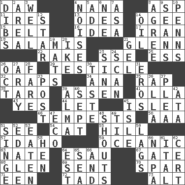 ACROSS 1. Fool 4. Nanny 8. Viper 11. Angers 13. Lyric poems 14. Double curve, resembling the letter S 15. Waist strap 16. The content of cognition 17. SW Asia republic 18. Deli grouping 21. American astronaut and politician John 22. Immoral or dissolute person 23. Compass dir. 25. Double-curved letter 26. Clumsy lout 29. A testis 32. Dice game 34. Santa ___, CA 35. Reproach for some lapse or misdeed 38. Pacific island yam 39. NE Netherlands city 41. Spanish pot 43. Affirmative reply 44. Allow 45. Small island 46. Storms 50. Auto club (abbr.) 51. Observe 54. Domesticated feline 55. Land elevation 57. Potato state 59. Pertaining to the sea 63. Nathan's nickname 64. Son of Isaac 67. Yard entry 68. Small, secluded valley 69. Transmitted 70. Practice fight 71. Car or cant ending 72. Small boys 73. Keyboard modifier key DOWN 1. Claim 2. Length times width 3. Not ill 4. Annoying sounds 5. Say or write further 6. Born 7. White ___ sheet 8. Match 9. Actors Connery and Penn 10. Actor Sean's family 12. Play the lead 14. Petroleum 19. Floor protectors 20. Mamie's mate 21. Set 23. Trig term 24. Skim 26. Sep. follower 27. Like ___ of sunshine 28. Conductor's collection 30. Clothes sense 31. Greek god of love 33. Mail 36. Silent film actress Nazimova 37. Entreaty 39. _ mater 40. Back-to-school mo. 42. _ moment's notice (2 wds.) 45. Small island 47. Environmental prefix 48. Yells 49. Nervous spasm 51. Scorch 52. Peak District village in England 53. Consumed 56. Fails to keep up a pace 58. Layer 60. California wine valley 61. Slanted text style (abbr.) 62. Foregone conclusion 64. Eastern Standard Time (abbr.) 65. Ocean 66. Plus