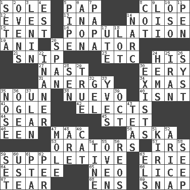 ACROSS 1. Flatfish 5. Infant food 8. Hoof sound 12. Nights before holidays 13. _ tizzy (2 wds.) 14. Annoying sound 15. Portable shelter 16. Census information 19. Black tropical American cuckoo 20. Legislator 21. Sever or remove by pinching or nipping 23. And so on (abbr.) 24. Part of HMS, perhaps 27. Political cartoonist Thomas 30. Suggestive of the supernatural 31. Disorder of the immune system 34. Dec. holiday 35. Part of speech 38. New (sp.) 40. Is not 41. Stare at amorously 42. Opts 44. Singe 45. Proofreading order 46. Car or cant ending 47. Apple computer (short form) 50. "____ silly question..." 53. Speakers 57. Big collection agency 59. Supplying deficiencies 63. 4th largest of the Great Lakes 64. First name in cosmetics 65. Modern: prefix 66. Louse (plural) 67. Separate forcefully 68. Followers of ems 69. Fastener DOWN 1. Stalk of a moss capsule 2. Baking chambers 3. Soviet premier 1918-24 4. Eastern Standard Time (abbr.) 5. Corncob 6. At once, immediately (arch.) 7. Dad 8. Small bed 9. Cards in a Roman deck? 10. Bear (Spanish) 11. Fenced enclosure 14. Drug cop 17. Shoshoni 18. Car dealer's back yard 20. Connect, as a bridge 22. Sillier 24. Folds over and sews together 25. SW Asia republic 26. System (abbr.) 28. Elected rep. 29. Loyal 30. Is extant 32. Set 33. Jacques Cousteau's middle name 35. Characteristic smell of wine 36. Double curve, resembling the letter S 37. ____ Bator 39. Sep. follower 43. Beverages made from leaves 47. Undercover agent 48. "We ___ not amused" (Victoria) 49. Domesticated feline 51. Japanese brewing company 52. N. Chile seaport 54. Prong on a fork 55. Baking chamber 56. Vintage cars 58. Ooze 59. Put into a specified state 60. Purpose 61. Parent Teacher Association (abbr.) 62. For each 63. Raised railways