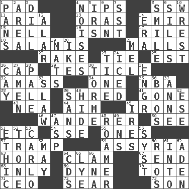 ACROSS 1. Writing tablet 4. Pinches, bites 8. Compass dir. 11. Operatic vocal solo 13. Mouths or openings 14. Independent ruler or chieftain 15. 1994 drama film starring Jodie Foster 16. Is not 17. Cause heat under the collar 18. Deli grouping 21. Promenades 22. Libertine 23. Standoff 25. Eastern Standard Time (abbr.) 26. Head covering 29. One of the two male reproductive glands 32. Collect or gather 34. Single 35. Basketball assoc. 38. Shout 39. Tear up 41. Went 43. Teachers' org. 44. Direct toward a target or goal 45. Metal shackles 46. Roamer 50. Observe 51. And so on (abbr.) 54. Compass dir. 55. Singles 57. _____ steamer (cargo ship) 59. Nineveh was its capital 63. Israeli folk dance 64. Burrowing marine mollusk 67. Post 68. Inwardly 69. Unit of force 70. Carryall 71. Corporate head (abbr.) 72. Shrivel 73. Boy, to dad DOWN 1. Zero-star reviews 2. Length times width 3. Deli pickle 4. Annoying sounds 5. Big collection agency 6. Baking dish 7. Fast jet (abbr.) 8. Grin 9. Beverly of Met fame 10. Take or capture by force 12. Having or resembling wings 14. Period 19. Floor coverings 20. Mamie's mate 21. Cartoonist voice _ Blanc 23. Prong on a fork 24. On the rocks 26. Island 27. So be it 28. Light colored 30. Singer Mel 31. Engineer (abbr.) 33. Cole _ (cabbage dish) 36. Scornful sounds 37. Singer Murray 39. Without 40. Flintstone garb 42. Compass dir. 45. Angers 47. Cleo's killer 48. Nomad 49. Followers of ems 51. Principle of right and wrong 52. Heavy duty weighing machine 53. Monte _, Las Vegas Hotel/Casino 56. System (abbr.) 58. Can I? 60. Vintage cars 61. To the inside or interior of 62. An important port of Yemen 64. Music discs 65. Potassium hydroxide 66. Santa ___, CA