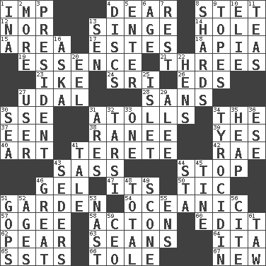 ACROSS 1. Naughty child 4. Letter starter 8. Proofreading order 12. Not either 13. Burn superficially 14. Opening into or through something 15. Type of rug 17. _____ Park, CO 18. Capital of Western Samoa 19. Gist 21. Triads 23. Eisenhower's nickname 24. Indian title of respect (Mr.) 26. Begley and Asner 27. Hereditary estate 28. Without 30. Compass dir. 31. Ringlike coral islands and reefs 34. Definite Article 37. Car or cant ending 38. Indian princess (variant) 39. Affirmative reply 40. Tate display 41. Cylindrical with tapered ends 42. Actress Charlotte 43. Backtalk 44. Constrict 46. Set 47. ___ a Wonderful Life 50. Nervous spasm 51. Place where plants grow 54. Pertaining to the sea 57. Double curve, resembling the letter S 58. Gambison 60. Prepare for publication 62. Lightbulb-shaped fruit 63. Seines 64. Call ___ day 65. Fast planes 66. Lacquered or enameled metalware 67. ___ Haven, CT DOWN 1. _ tizzy (2 wds.) 2. Greater amount 3. Elected leader of a country 4. Plates 5. Keyboard key 6. Personal question 7. Repose 8. Broken pieces 9. Drinks excessively 10. Writer Wiesel 11. Afternoon social gatherings 13. Elected rep. 16. "____ silly question..." 20. Snakelike fish 22. Coop moms 25. Small island 27. One who makes use of a thing 29. Toward shelter 30. Ocean 31. Ancient Greek god of war 32. Tarsus (plural) 33. Single 34. Polypeptide antibiotic 35. Pile 36. Compass dir. 41. Lie 43. Spring feasts 44. R.R. building 45. Prong on a fork 46. Relatively large 48. "_____ Recall" 49. Biscuitlike quick bread 51. Republicans 52. Grows older 53. Political cartoonist Thomas 55. Followers of ems 56. Quote 59. Corporate head (abbr.) 61. The 23rd letter of the Hebrew alphabet