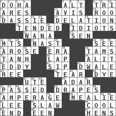ACROSS 1. Capital of the state of Qatar 5. The first octave above the treble staff 8. Three (prefix) 11. Ancient Greek god of war 12. Deliberation 13. Friend of Pooh 14. Small ungulate mammals of Africa 17. Accusation by an informer 19. Watched over 21. Foolish or stupid persons 22. Nanny 23. Elected rep. 24. Mountains (abbr.) 27. Political cartoonist Thomas 29. Observe 32. Came up 34. Period 36. Scottish caps 37. Hyperbolic tangent 38. Pet locale 39. Set down 40. Whirlpool 41. Small drink 42. A sleeping potion; an opiate (poet.) 43. To sift 44. Pull into pieces 46. Color 47. Shoshoni 50. The sixth month of the Jewish calendar 52. Went by 55. Window treatments 57. Electrical Measurement 59. Ear of corn 62. Area sheltered from the wind 63. Cole _ (cabbage dish) 64. Calm and collected 65. Conclude 66. Car or cant ending 67. Coop moms DOWN 1. June honoree 2. Mouth or opening 3. Command 4. NE Netherlands city 5. "___ Maria" 6. Ms. Damita and namesakes 7. Sadhe (variant) 8. Musical group of three 9. Carrot, for example 10. Charged atoms 12. Find the sum of 15. Empty; void 16. Pulitzer Prize-winning author Ferber 18. Metal container 20. Artist's stands 24. Mother 25. Exchange 26. Something which is sent 28. Distinguishing feature 29. Vegetable dish 30. Poet Dickinson 31. First name in cosmetics 33. Like a shrinking violet 35. Become visible 36. The 23rd letter of the Hebrew alphabet 42. Window treatment 45. First of billions? 47. Purpose 48. Laconic 49. Peak District village in England 51. Arrive at 52. Diluted with white 53. So be it 54. Drove too fast 55. Morning condensation 56. A type of plum 58. Separate the seeds from cotton 60. Electrically charged atom 61. Raised railways