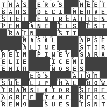 ACROSS 1. It was, poetically 5. Greek god of love 9. Confront 13. Taverns 14. Tenth: prefix 15. Impudent aggressiveness 16. Proofreading order 17. Pleas 19. Writing instrument 20. One (Scot) 21. Raised railways 22. Eastern Standard Time (abbr.) 23. Water falling in drops from the sky 25. Be seated 26. Rhinal 30. Domed church section 34. Place in a line 35. Commotion 36. It's straight from the horse's mouth 39. Abounding in pines 42. "Two Mules for Sister ____" 43. Writer Wiesel 44. Ancient Celtic tribe of eastern Britain 46. Arab leader 47. Olfactory organs 48. Greek goddess of the dawn 51. Tiny particle 54. Take to court 57. Mouth edge 58. Actor Linden 60. Arrow shooter 62. Interpreter 65. Father 66. Match 67. Not wild 68. Vintage cars 69. Former U.S. Attorney General Janet 70. Institutes legal proceedings 71. Is not DOWN 1. Cook's measure (abbr.) 2. Wetness 3. Sports stadium 4. Fast jet (abbr.) 5. Locale of original sin 6. French philosopher Descartes 7. Sep. follower 8. Fathers 9. Was introduced to 10. One of the Great Lakes 11. Nights before holidays 12. Trial 15. Political cartoonist Thomas 18. Biblical high priest 20. Of or related to the anus 24. More empty; more void 27. Small drink 28. Cuckoo 29. Soviet premier 1918-24 30. Help 31. Parent Teacher Assoc. 32. Title for a knight 33. Period 36. Portuguese money of account (variant) 37. Shade tree 38. One more than two 40. Environmental prefix 41. Affirmative reply 45. Anneal 48. Otherwise 49. Petroleum 50. Arguments over trivial matters 52. Off-Broadway awards 53. Person of subnormal intelligence 54. Play the lead 55. Goad 56. Merit 58. Dwelling 59. Ancient Greek god of war 61. Compass direction 63. Modern: prefix 64. The 19th letter of the Greek alphabet 65. Indian title of respect (Mr.)