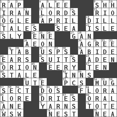 ACROSS 1. Reproach for some lapse or misdeed 4. Toward shelter 8. Quiet! 11. SW Asia republic 13. Domineers 15. _ de Janeiro 16. Stare at amorously 17. Showery time 18. Deli pickle 19. Falsehoods 21. Ocean 22. Small island 23. Insidious 24. Compass dir. 27. Separate the seeds from cotton 29. A really long time 30. Match 34. Bar bill 36. United States Postal Service (abbr.) 39. Stay 40. Hearing organs 41. Costumes for special activities 43. An important port of Yemen 44. Greek mythologigal hunter 46. Suggestive of the supernatural 47. Nine, plus one 48. Having lost freshness 49. Restaurants 51. Shoshoni 53. Personal Computers (abbr.) 54. Large cup 57. Religious group 60. Two (Sp.) 63. Plants 65. Old wives' tales, e.g. 66. Frees from moisture 69. Spoken 70. A saturated hydrocarbon 71. Tall tales 72. Haul 73. Compass dir. 74. Egg locale 75. Teachers' org. DOWN 1. Debaucheries 2. Therefore, facetiously 3. Chummy 4. According to 5. Chop off 6. Blunders 7. Singer Brickell 8. Indian titles of respect 9. Land elevation 10. Hollow 12. Born 14. Volcanic refuse 18. Empty-headed or silly people 20. Perceive with the eye 25. Good sense 26. Follow as a consequence or result 28. Auto club (abbr.) 29. Utter; complete 31. Travel on or in a vehicle 32. Locale of original sin 33. Car or cant ending 34. Small pie 35. Roberta Peters solo 37. Sliced dessert 38. Empty completely 40. Greek goddess of the dawn 42. Synchronize (abbr.) 45. Remaining after all deductions 50. Science/research agcy. 52. Whirlpool 54. Person of subnormal intelligence 55. A salt of uric acid 56. An organ shaped like a helmet 57. Cole _ (cabbage dish) 58. Immeasurably long periods of time 59. Ship's personnel 61. Northwest Algerian city 62. Title for a man of rank and authority 64. Car dealer's back yard 67. Followers of ems 68. Fast jet (abbr.)