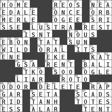 ACROSS 1. Residence 5. Vintage cars 9. Teachers' org. 12. Peak District village in England 14. Single time 15. Globe 16. Haggard of country music 17. Double curve, resembling the letter S 18. Indian title of respect (Mr.) 19. Compass dir. 20. A period of five years 23. Repose 24. Is not 25. Good sense 27. Inky black, to poets 30. Make lace 32. Player for Phoenix 33. Rampant 34. Taken by mouth 36. It is 38. Compass dir. 39. Supplement with great effort 40. Krazy ___ of comics 43. Girls' org. (abbr.) 46. Monthly bill 48. Indonesian resort city 49. Ring climax 51. "Barney Miller" actor Jack 52. Stare 53. One who doesn't tell the truth 54. Printing process, for short 56. Scent 58. Keyboard key 61. Strike 64. Slender fish 65. Bristle 66. Tons 68. To free from 69. Hyperbolic tangent 70. Lugs 71. Curvy letter 72. Having or resembling wings 73. Portable shelter DOWN 1. Is hesitant and indecisive 2. Lyric poems 3. Female horse 4. Pipe bend 5. Carrot, for example 6. Engineer (abbr.) 7. Seas 8. Perceive with the eye 9. Olfactory organs 10. Blunders 11. "This won't hurt ____!" 13. Snakelike fish 21. To (old English) 22. A viewer who gazes fixedly 23. The smallest animal of a litter 24. Indiana (abbr.) 26. Fr. "Yes" 27. She-sheep 28. Storage container 29. Cassini of fashion 31. Proceeds 35. Poe poem 37. Heroin 41. Everything 42. Neckwear 44. Agitate 45. Alias (abbr.) 47. A blast of a horn 48. Surprise greeting 50. Severe or trying experience 53. Domineers 55. Trial 56. Legendary monster 57. Raised platform 59. Inactive volcano in Sicily 60. Cowardly lion portrayer 61. Assign a rank or rating to 62. Arabian gulf 63. Inconspicuous attention getter 65. R.R. building 67. Small bed