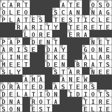 ACROSS 1. Heavy open wagon 5. Had dinner 8. Bear (Spanish) 11. Butter sub 12. Examine minutely or intensely 13. Tired old horse 14. Food holders 17. A testis 19. Noteworthy scarcity 21. Cylindrical with tapered ends 22. Old wives' tales, e.g. 23. Epoch 24. Infant food 27. Gouge 29. Remaining after all deductions 32. Get up 34. 24 hours 36. Went 37. Actor's bit 38. Supplement with great effort 39. Having or resembling wings 40. Rendezvous 41. Lair 42. Naughty children 43. Roguish 44. Play the lead 46. Born 47. Wet nurse (var.) 50. Afresh 52. Declaimed 55. Michaelmas daisies 57. Conveyance 59. Foolish or stupid persons 62. Heredity factor (abbr.) 63. Roll call or roster of names 64. Hoop that covers a wheel 65. Manchild 66. Eastern Standard Time (abbr.) 67. Writer Wiesel DOWN 1. Police officer (slang) 2. 100% 3. Hitchcock's "____ Window" 4. Add up to 5. Adept person 6. Clothes sense 7. Keyboard key 8. At one time in the past 9. Table seasoning 10. Double curve, resembling the letter S 12. Filthy place 15. Eat (away) 16. Title for a man of rank and authority 18. Retirement account (abbr.) 20. Watched over 24. Insides of hands 25. Satellite of Uranus 26. Abounding in pines 28. Receives possession of 29. Pitcher Ryan 30. Maternal 31. Laconic 33. Arrange properly for use 35. Gossips 36. Slender fish 42. A special lineage 45. Opposed to 47. "One Day ___ Time" 48. Distance measurement (Brit.) 49. Goodbye (Sp.) 51. Compose 52. Likelihood 53. Western Nevada city 54. Actor Alda or Thicke 55. Santa ___, CA 56. Land 58. Baseball player Mel 60. Three (prefix) 61. Observe