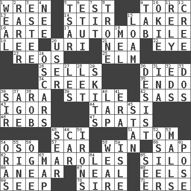 ACROSS 1. Songbird 5. Trial 9. Torque (variant) 13. Relaxation 14. Agitate 15. Member of a famous L.A. basketball team 16. Johnson of "Laugh-In" 17. Car 19. Area sheltered from the wind 20. RI univ. 21. Teachers' org. 22. Sight organ 23. Vintage cars 25. Shade tree 26. Makes a sale 30. Passed on 34. Small stream 35. Inside; within (prefix) 36. "Two Mules for Sister ____" 39. Vertical member of a panel or frame 42. Backtalk 43. Russian composer Stravinsky 44. Tarsus (plural) 46. Confederate soldiers (slang) 47. Arguments over trivial matters 48. _-fi 51. Smallest unit of an element 54. Bear (Spanish) 57. Ewer handle 58. Acquire through effort 60. Plant excrement 62. Complicated, petty procedures 65. Grain storage tower 66. Approach 67. Anneal 68. Snakelike fish 69. Ooze 70. Father 71. Celtic language DOWN 1. Welt 2. More valued for its uncommonness 3. First name in cosmetics 4. Born 5. Russian ruler of old 6. Needle holder 7. Be seated 8. Heavy duty weighing machine 9. Bar bill 10. Migrant worker of the '30s 11. Have confidence or faith in 12. Algonquian 15. Rich soil 18. Cartoonist voice _ Blanc 20. One who uses or employs something 24. Motion picture awards 27. French article 28. Allow 29. Burlesque acts 30. Cease 31. _ tizzy (2 wds.) 32. Begley and Asner 33. Two (Sp.) 36. Title for a knight 37. Ripen 38. Director Reiner 40. Infant locale 41. Epoch 45. Comedian Laurel of Laurel & Hardy 48. Singe 49. Automobile 50. Removes the wrinkles 52. Flexible twig of a willow tree 53. Promenades 54. Mouths or openings 55. Trig term 56. Double curve, resembling the letter S 58. Erode 59. Small island 61. Airs 63. Atlas unit 64. Luau accessory 65. Observe