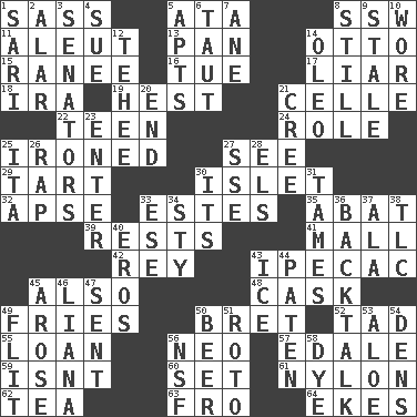 ACROSS 1. Backtalk 5. _ moment's notice (2 wds.) 8. Compass dir. 11. Native American of Southwest Alaska 13. Baking dish 14. "Beetle Bailey" pooch 15. The wife of a rajah (variant) 16. Third day of the wk. 17. One who doesn't tell the truth 18. Retirement account (abbr.) 19. Command 21. Cell (Danish) 22. Adolescent 24. Hero or heavy, e.g. 25. Pressed 27. Perceive with the eye 29. Small pie 30. Small island 32. Domed church section 33. _____ Park, CO 35. Blind as ____ 39. Musical pauses 41. Shopping center 42. Marina Del _, California 43. Medicinal drug used to evoke vomiting 45. In addition 48. Keg 49. Strips of potato fried in deep fat 50. Cy Young winner Saberhagen 52. Small amount or degree 55. Grant temporary use of 56. Modern: prefix 57. Peak District village in England 59. Is not 60. Arrange properly for use 61. High-strength synthetic material 62. Afternoon social gathering 63. Away 64. Supplements with great effort DOWN 1. Indian skirt 2. Having or resembling wings 3. Elected representatives 4. Institute legal proceedings 5. Flats, for short 6. Tense 7. A saturated hydrocarbon 8. Free from disturbance or agitation 9. Showing deterioration from age 10. Had on 12. Giggle 14. Butter sub 20. Conclude 21. Algonquian 23. Keyboard key 25. Call ___ day 26. Reproach for some lapse or misdeed 27. Compass dir. 28. Raised railways 30. ___ a Wonderful Life 31. Domesticates 33. Compass dir. 34. Filthy place 36. Sass 37. In the manner of 38. Affectionate concern, for short 40. Greek god of love 43. Frozen water 44. Eucharist need 45. Came up 46. Climbing, woody, usually tropical vines 47. Transmitted 49. Sudden quick movement 50. Fermented drink made from hops 51. Printing process, for short 53. _ vera 54. Hiding places for outlaws 56. Overdraft (abbr.) 58. Color