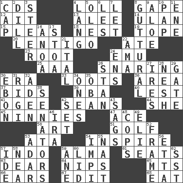 ACROSS 1. Music discs 4. Hang loosely or laxly 8. Yawn 12. Small island 13. Toward shelter 14. ____ Bator, Mongolia 15. Entreaties 18. A home for chicks 19. Drink excessively 20. Small, flat, pigmented spot on the skin 22. Had dinner 23. Carrot, for example 24. Australian flightless bird 25. Auto club (abbr.) 26. Catching in a trap 30. Period 33. Plunders 36. Type of rug 37. Auction offers 39. Basketball assoc. 40. For fear that 41. Double curve, resembling the letter S 42. Actors Connery and Penn 44. A female animal or person 45. Simpletons 47. Adept person 50. Nonscientific branch of learning 51. _ course 53. "One Day ___ Time" 54. Heighten or intensify 57. Southeast Asian peninsula 59. _ mater 61. Theater features 63. Letter starter 64. Cuts off 65. Mountains (abbr.) 66. Hearing organs 67. Prepare for publication 68. Consume DOWN 1. Head covering 2. Deli pickle 3. Guide 4. Long (Scottish) 5. Butter sub 6. French article 7. Allow 8. From the throat 9. Medicinal plant 10. Infant food 11. Compass dir. 16. Small Philippine buffalo 17. Portico 21. Slanted text style (abbr.) 22. Nanny (var.) 24. Followers of ems 26. Comedian Laurel of Laurel & Hardy 27. Angers 28. Delicate 29. Yard entry 30. Inky black, to poets 31. Swiss mountan, "Queen of the Mountains" 32. An important port of Yemen 34. Singles 35. Chief or king in Benin or Nigeria 38. Legislators 42. Arrange properly for use 43. Settles 46. Retirement account (abbr.) 48. 911 reaches them 49. Writer Wiesel 52. Movie unit 53. The sixth month of the Jewish calendar 54. Body of Kaffir warriors 55. Political cartoonist Thomas 56. Singer James 57. Binary compound 58. Teachers' org. 59. One (Scot) 60. Flaplike covering 62. Fast jet (abbr.)