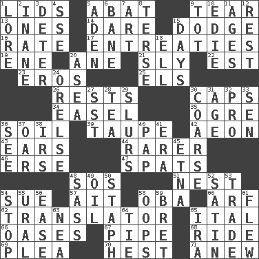 ACROSS 1. Flaplike coverings 5. Blind as ____ 9. Pull into pieces 13. Washington bills 14. Have the gumption 15. Evade 16. Pace 17. Pleas 19. Compass dir. 20. One (Scot) 21. Mischievous 22. Eastern Standard Time (abbr.) 23. Greek god of love 25. Raised railways 26. Musical pauses 30. Balmoral and tarboosh 34. Artist's stand 35. Legendary monster 36. Earth 39. Grayish beige 42. A really long time 43. Hearing organs 44. More uncommon 46. Celtic language 47. Arguments over trivial matters 48. Distress signal 51. Egg locale 54. Take to court 57. Small island 58. Chief or king in Benin or Nigeria 60. Sandy's bark 62. Interpreter 65. Slanted text style (abbr.) 66. Fertile tracts in a desert 67. Corncob 68. Travel on an animal 69. Entreaty 70. Behest 71. Afresh DOWN 1. Old wives' tales, e.g. 2. Empty; void 3. Prevent from occurring 4. Compass dir. 5. Arabian gulf 6. Object of repulsion 7. Tate display 8. Laconic 9. Small child 10. Singer Brickell 11. Matures 12. Respite 15. 24-hour periods 18. Pipe bend 20. At sea 24. Threatening words 27. Fast jet (abbr.) 28. Afternoon social gathering 29. Plays smoothly or legato 30. Unrefined 31. Ripen 32. Adept person 33. Elected rep. 36. Observe 37. Boat paddle 38. Big collection agency 40. Infant food 41. Epoch 45. Inactive volcano in Sicily 48. Backtalk 49. Petroleum 50. Staphylococcus 52. Smooth fabric 53. Exchange 54. Halt 55. Mountain range 56. Comfort 58. I made a mistake 59. Cy Young winner Saberhagen 61. Soared 63. Teachers' org. 64. Standoff 65. Lyricist Gershwin