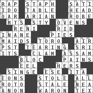 ACROSS 1. Hit sharply and swiftly 4. Staphylococcus 9. Suttee (variant) 13. Wedding promise 14. Eating place 15. Froth on beer 16. Rowing implement 17. Believer in; advocate of (suffix) 18. Loose flowing garment 19. Mountains (abbr.) 21. Filthy place 22. Baking chambers 24. Painter Guido (1575-1642) 26. To free from 27. Silly 29. Sliced desserts 30. Women servants 31. "Corrida" creature 33. Atmosphere 36. Pacific Standard Time (abbr.) 37. Pulling into pieces 40. _ Lanka 41. ___ a Wonderful Life 42. Dollar (slang) 43. Indian state 45. Alliance 47. Aches 48. Snakelike fish 49. Possessive pronoun 50. Scorch 52. Compass dir. 54. Call ___ day 56. Immeasurably long periods of time 57. Fur scarf 59. Everything 61. Printing process, for short 62. Showing deterioration from age 63. Teachers' org. 64. Soon (poet.) 65. Make _____ (do battle with) 66. John Ritter's dad DOWN 1. _ de Janeiro 2. First of billions? 3. Likenesses of persons 4. R.R. building 5. Tarsus (plural) 6. "This won't hurt ____!" 7. Live dramatic performance 8. Layer 9. Fragments 10. A really long time 11. Bar bills 12. Binary compound 20. Transmit 22. Greek mythologigal hunter 23. Compete 25. Egg locale 27. Body of Kaffir warriors 28. Political cartoonist Thomas 29. Demure 31. Baby powder 32. Mouth or opening 33. Helper 34. SW Asia republic 35. Basketball hoops 38. Learning spot: Fr. 39. Stare wonderingly 44. Indian skirt 45. Gillaume's butler role 46. Part of a journey 49. Phone greeting 50. Within a short period 51. To the inside or interior of 52. Singer James 53. Fly high 55. Toward shelter 56. Period 57. Compass dir. 58. Car or cant ending 60. Not strict