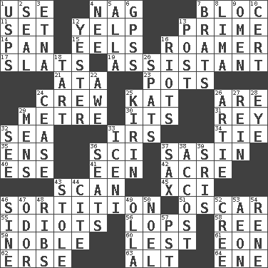ACROSS 1. Purpose 4. Tired old horse 7. Group of countries in special alliance 11. Put into a specified state 12. Sharp bark 13. A-one 14. Baking dish 15. Snakelike fish 16. Nomad 17. Narrow boards 19. Aide 21. "One Day ___ Time" 23. Plant holders 24. Group working together 25. Krazy ___ of comics 26. "We ___ not amused" (Victoria) 29. Distance measurement (Brit.) 30. It is 31. Marina Del _, California 32. Ocean 33. Big collection agency 34. Standoff 35. Followers of ems 36. _-fi 37. Indian antelope 40. Compass dir. 41. Car or cant ending 42. 1/640 square mile 43. Examine hastily 45. One more than ninety 46. Decision 51. Witty Wilde 55. Foolish or stupid persons 56. Chops off 58. To separate or throw off 59. Having high moral qualities 60. For fear that 61. Period of immesurable duration 62. Celtic language 63. The first octave above the treble staff 64. Compass dir. DOWN 1. United States Postal Service (abbr.) 2. Lick closed 3. Inactive volcano in Sicily 4. Born 5. Silent film actress Nazimova 6. Global Positioning Systems (abbr.) 7. Naughty children 8. Pale green bean 9. Sign of things to come 10. Certainty 12. Last past 13. Mail 16. Debaucheries 18. Small pie 20. Arguments over trivial matters 22. Deep reverence 24. Desist 25. Japanese brewing company 26. Nick name for Arthur 27. It's straight from the horse's mouth 28. Sight organ 29. Not women's 32. Observe 33. Ancient Celtic tribe of eastern Britain 36. Theater features 37. Saxophone 38. Buttonhole 39. Indian titles of respect 43. Fur scarf 44. Quote 46. Trig term 47. Scent 48. Chest bones 49. Water jar 50. Christmas carol 52. Algonquian 53. A really long time 54. French philosopher Descartes 57. Pacific Standard Time (abbr.)