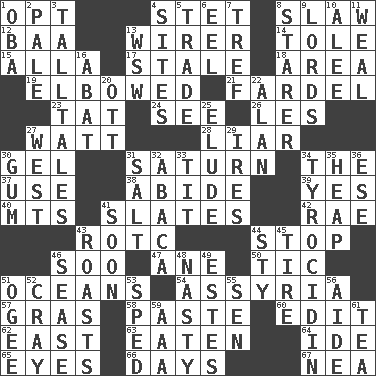 ACROSS 1. Choose 4. Proofreading order 8. Cole _ (cabbage dish) 12. Sound made by sheep 13. One who wires 14. Lacquered or enameled metalware 15. Silent film actress Nazimova 17. Lacking originality or spontaneity 18. Type of rug 19. Shoved, as through a crowd 21. Bundle 23. Make lace 24. Perceive with the eye 26. French article 27. Electrical Unit 28. One who doesn't tell the truth 30. Set 31. Titan orbits this 34. Definite Article 37. Purpose 38. Remain 39. It is so 40. Mountains (abbr.) 41. Chalkboards 42. Actress Charlotte 43. College mil. group 44. Halt 46. "Barney Miller" actor Jack 47. One (Scot) 50. Nervous spasm 51. Seas 54. Nineveh was its capital 57. Pate de foie ____ 58. Thick mixture 60. Prepare for publication 62. Compass direction 63. Consumed 64. Binary compound 65. Snake ____ (dice throw) 66. 24-hour periods 67. Teachers' org. DOWN 1. Chief or king in Benin or Nigeria 2. Diluted with white 3. Baron Munchausen's specialties 4. Locates 5. Buy and sell 6. Snakelike fish 7. Not kosher 8. A viewer who gazes fixedly 9. Titled peers of a realm 10. Toward shelter 11. Welt 13. Compass dir. 16. Blind as ____ 20. Baseball player Mel 22. ____ Jay Lerner 25. Evade 27. 270 degrees 29. Angers 30. Chewing product 31. Table seasoning 32. Phillipine bananalike plant 33. Teat (slang) 34. Polypeptide antibiotic 35. Pile 36. Compass dir. 41. Within a short period 43. Exposes to great heat 44. Filthy place 45. Hoop that covers a wheel 46. Gospel singer Marvin 48. Thoroughly unpleasant 49. _____ Park, CO 51. Double curve, resembling the letter S 52. Supercomputer manufacturer 53. Hurried 55. Elected rep. 56. Helper 59. Auto club (abbr.) 61. Beverage made from leaves