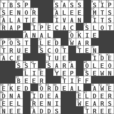 ACROSS 1. Cook's measure (abbr.) 5. Backtalk 9. Small drink 12. Sir (Sp.) 14. Toward shelter 15. Mountains (abbr.) 16. Having winglike extensions 17. _ the terrible 18. It is 19. Hit sharply and swiftly 20. Medicinal drug used to evoke vomiting 23. Notch 24. Of or related to the anus 25. Migrant worker of the '30s 27. Mail 30. Directed 32. Armed conflict 33. Loyal 34. Native of Scotland 36. "___ Little Indians" 38. Adept person 39. Third day of the wk. 40. Binary compound 43. Fast jet (abbr.) 46. "Two Mules for Sister ____" 48. Margarine 49. Untruth 51. Slangy assent 52. Stitched 53. Fermented drink made from hops 54. Small quarrel 56. Made supply last 58. Severe or trying experience 61. Deep reverence 64. Heredity factor (abbr.) 65. The main thing one is thinking about 66. A person who is older than you are 68. Snakelike fish 69. Painter Guido (1575-1642) 70. Puts on (as clothing) 71. Born 72. Sums up 73. Relationship diagram DOWN 1. Russian ruler of old 2. Actor Lugosi 3. Fastener 4. Plant holder 5. Ketch in the Levant 6. Inventor's middle name 7. Manatee 8. Elected rep. 9. Grin 10. "Tell ____ the Marines!" 11. Inconspicuous attention getter 13. It's straight from the horse's mouth 21. Friends 22. Chooses 23. Beget 24. Had dinner 26. Krazy ___ of comics 27. Parent Teacher Assoc. 28. The grampus (Milton) 29. Takes to court 31. A city in N France, SE of Calais 35. Cylindrical with tapered ends 37. The longest river in the world 41. Morning condensation 42. Period of immesurable duration 44. Downhill vehicle 45. Neckwear 47. Capital of Western Samoa 48. Order of Saint Francis (abbr.) 50. Eaten away 53. Memphis, Tenn. Street 55. Soared 56. Genesis locale 57. Leg joint 59. Tear apart 60. Raised platform 61. The sixth month of the Jewish calendar 62. We are 63. Celtic language 65. Retirement account (abbr.) 67. Allow