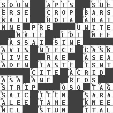 ACROSS 1. Within a short period 5. Tenement units (abbr.) 9. Institute legal proceedings 12. Celtic language 13. Riding implement 14. Soap units 15. Electrical Unit 16. Roll call or roster of names 17. Blind as ____ 18. Compass dir. 19. Before (prefix) 21. Join together 22. Nathan's nickname 24. Car dealer's back yard 26. Born 27. Slender Brazilian palm 28. Trig term 29. Advice 30. Sibling's daughter 32. Keg 36. Moving, as bait 37. Actress Charlotte 38. Toward the sea 39. Arabian gulf 40. Clothes sense 42. Is not 43. Quote 44. Sour-tasting 46. White ___ sheet 49. A saturated hydrocarbon 50. Vintage cars 51. Empty completely 53. Bear (Spanish) 54. Label 57. Ketch in the Levant 58. A distinct part 61. "Two Mules for Sister ____" 62. Toward shelter 63. Not wild 64. Leg joint 65. Cartoonist voice _ Blanc 66. Make senseless or dizzy 67. Slanted text style (abbr.) DOWN 1. Stitched 2. NW Algerian seaport 3. Clearly or manifestly demonstrative 4. Fish or hair follower 5. Land measure 6. Adept person 7. Small child 8. Health resort 9. Unit of acoustic absorption 10. A salt of uric acid 11. First name in cosmetics 14. Forbid 19. Parent Teacher Assoc. 20. It's straight from the horse's mouth 21. Shoshoni 23. NE Netherlands city 24. It is permitted: Lat. 25. Single 27. Enthusiastic 28. Gospel singer Marvin 29. Wing 31. Feeling or showing extreme anger 32. Capital of Egypt 33. Aide 34. Post 35. Krazy ___ of comics 40. Metal container 41. Hearing organs 43. Head covering 45. Corporate head (abbr.) 46. Indian state 47. Showing deterioration from age 48. Satellite of Uranus 52. Frozen water 53. Sign of something about to happen 55. Type of rug 56. Highlander 58. ___ a Wonderful Life 59. Make lace 60. Australian flightless bird 61. What Jean-Claude Killy likes to do