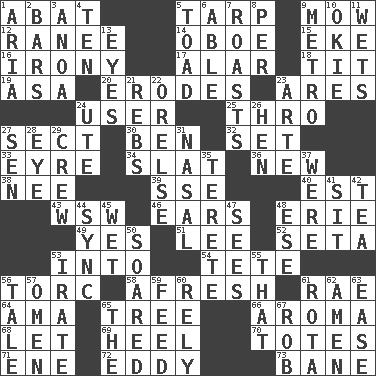 ACROSS 1. Blind as ____ 5. Canvas cover 9. Cut the grass 12. Indian princess (variant) 14. Mitch Miller's instrument 15. Supplement with great effort 16. Literary sarcasm 17. Having or resembling wings 18. Teat (slang) 19. White ___ sheet 20. Eats (away) 23. Ancient Greek god of war 24. One who makes use of a thing 25. Through, poetically 27. Religious group 30. Benjamin's nick name 32. Put into a specified state 33. Jane of fiction 34. Narrow board 36. ___ Haven, CT 38. Born 39. Compass dir. 40. Eastern Standard Time (abbr.) 43. Compass dir. 46. Hearing organs 48. 4th largest of the Great Lakes 49. Consenting reply 51. Area sheltered from the wind 52. Bristle 53. To the inside or interior of 54. Wig 56. Torque (variant) 58. Anew 61. Actress Charlotte 64. Wet nurse (var.) 65. Family _ (genealogy) 66. Scent 68. Allow 69. Person who is morally reprehensible 70. Hauls 71. Compass dir. 72. Whirlpool 73. Object of repulsion DOWN 1. Roberta Peters solo 2. Drinking establishments 3. Small Philippine buffalo 4. Nine, plus one 5. Frog relative 6. Competent 7. Cooks with dry heat, as in an oven 8. For each 9. Paris' subway 10. Migrant worker of the '30s 11. Soaks 13. Sight organs 21. Confederate soldiers (slang) 22. Threatening words 23. Johnson of "Laugh-In" 24. Shoshoni 26. Layer 27. Elected rep. 28. Sight organ 29. Group working together 31. Rhinal 35. Cylindrical with tapered ends 37. Past tense of be (plural) 41. Be seated 42. Afternoon social gathering 44. Synchronize (abbr.) 45. Dripping 47. Observes 48. Compass dir. 50. Flew 53. Feeling or showing extreme anger 55. Not this but _ 56. Lie 57. Sign of things to come 59. Nourish 60. Have trust in 61. Roll call or roster of names 62. So be it 63. Relaxation 65. Definite Article 67. Director Reiner