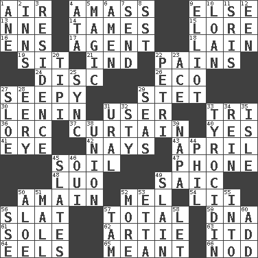 ACROSS 1. Wind 4. Collect or gather 9. Otherwise 13. Compass dir. 14. Corrects by punishment or discipline 15. Old wives' tales, e.g. 16. Followers of ems 17. Rep 18. (Had) reclined 19. Be seated 21. Working for oneself (abbr.) 22. Aches 24. Compact _ 26. Environmental prefix 27. Not well drained, as in land 29. Proofreading order 30. Soviet premier 1918-24 31. One who makes use of a thing 33. Three (prefix) 36. The grampus (Milton) 37. Window treatment 40. Consenting reply 41. Sight organ 42. Negative votes 43. Showery time 45. Land 47. Give a jingle 48. Nilotic language 49. Ketch in the Levant 50. With great haste 52. Cartoonist voice _ Blanc 54. Cards in a Roman deck? 56. Narrow board 57. Add up to 59. Heredity factor (abbr.) 61. Flatfish 62. Nick name for Arthur 63. It would 64. Snakelike fish 65. Intended 66. Dreamland DOWN 1. A saturated hydrocarbon 2. Restaurants 3. Home 4. _ moment's notice (2 wds.) 5. Mysterious quality of enchantment 6. So be it 7. Transmit 8. Fast jet (abbr.) 9. American author Paul (1891-1958) 10. Grant temporary use of 11. Indian titles of respect 12. Car or cant ending 20. Native american tent (variation) 22. _ dish (used to culture cells) 23. Adept person 25. Synchronize (abbr.) 27. _ gin 28. Suggestive of the supernatural 29. Oceans 31. Mountain range 32. Filthy place 33. Polypeptide antibiotic 34. It's straight from the horse's mouth 35. Capri or Wight 38. The state of being joined or united 39. California wine valley 44. Silvers or Donahue 45. Chalkboards 46. Fr. "Yes" 49. Killed 50. Medicinal plant 51. Promenade 52. Greater amount 53. Singer James 55. To the inside or interior of 56. Compass dir. 57. Scottish cap 58. Allow 60. Increase