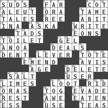 ACROSS 1. Soap bubbles 5. Distant 8. Small bed 11. Native American of Southwest Alaska 13. Mouth or opening 14. Docile 15. Lies 16. To riddle 17. "This won't hurt ____!" 18. _ tizzy (2 wds.) 19. "____ silly question..." 21. Compose 22. Small boys 24. Immeasurably long periods of time 25. Bathroom plumbing fixture 27. Set 29. Small Philippine buffalo 30. Allots cards 32. Gouge 33. Crowbar 35. Lug 39. Make improvements or corrections to 41. Advice 42. Mature 43. Erase 45. Table seasoning 48. One who makes use of a thing 49. Citrus fruits 50. Spoils 52. To free from 55. Mouths or openings 56. Coat; cloak 57. Elude 59. Relief 60. Deep reverence 61. Consumed 62. Curvy letter 63. Purpose 64. Beverages made from leaves DOWN 1. Suttee (variant) 2. ____ Bator 3. Accusation by an informer 4. Institute legal proceedings 5. Tined utensil 6. Type of rug 7. Actress Charlotte 8. Small house or cottage 9. Leaves out 10. False hair 12. Sadhe (variant) 14. Pacific island yam 20. Fast jet (abbr.) 21. Water source 23. Having winglike extensions 25. Small amount or degree 26. Single 27. Unit of force equal to gravity 28. Hearing organ 30. Movie disc 31. Showing deterioration from age 33. Part of a journey 34. Compass dir. 36. Make much ado about nothing 37. Teat (slang) 38. Compass dir. 40. Floor protectors 43. Superhero pair 44. First name in cosmetics 45. Titles for men of rank and authority 46. Collect or gather 47. For fear that 49. Old wives' tales, e.g. 50. Coldest temperatures 51. Double curve, resembling the letter S 53. The content of cognition 54. Hiding places for outlaws 56. The 19th letter of the Greek alphabet 58. Large container
