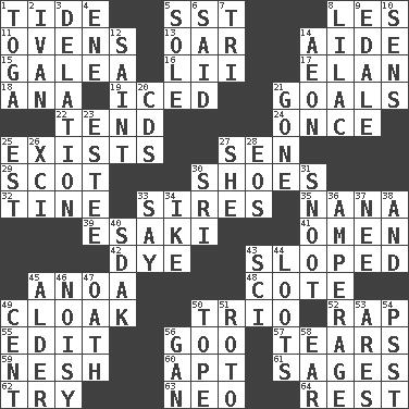 ACROSS 1. Event that recurs at intervals 5. Fast jet (abbr.) 8. French article 11. Baking chambers 13. Boat paddle 14. Helper 15. An organ shaped like a helmet 16. Cards in a Roman deck? 17. Liveliness 18. Santa ___, CA 19. On the rocks 21. Scores awarded for successful feats 22. Be inclined (to) 24. Single time 25. Is extant 27. Elected rep. 29. Native of Scotland 30. Imelda's hoard 32. Prong on a fork 33. Founders of families 35. Grandmother 39. 1973 Nobel Price Winner (Physics) Leo 41. Sign of things to come 42. Color 43. Had an oblique or slanted direction 45. Small Philippine buffalo 48. ____ d'Azur (French Riviera) 49. Covering 50. Musical group of three 52. Hit sharply and swiftly 55. Prepare for publication 56. Thick or sticky substance 57. Rends 59. Delicate 60. Fitting 61. Gurus 62. Attempt to accomplish something 63. Modern: prefix 64. State of inaction DOWN 1. Ancient Roman robe 2. "Terrible" tsar 3. Accusation by an informer 4. Compass dir. 5. Flatfish 6. Alleged 7. Three (prefix) 8. Pale purple color 9. Peak District village in England 10. Elected reps. 12. Virtuous person 14. Period of immesurable duration 20. Music discs 21. Went 23. First name in cosmetics 25. Eastern Standard Time (abbr.) 26. One more than ninety 27. A female animal or person 28. Greek goddess of the dawn 30. Indian title of respect (Mr.) 31. Snout, nose 33. Declare 34. Mamie's husband 36. Electrical Measurement 37. Born 38. Also 40. Neighbor of Neb. 43. _-fi 44. Plunders 45. Tree or shrub in the Birch family 46. Annoyingly loud 47. Pledge 49. Penny 50. Drink excessively 51. Printing process, for short 53. Ancient Greek god of war 54. Inconspicuous attention getter 56. Separate the seeds from cotton 58. Hearing organ