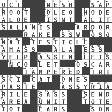 ACROSS 1. Sep. follower 4. Soft 8. Plant excrement 11. Carrot, for example 13. Margarine 14. Method 15. Medicinal plant 16. Is not 17. Set down 18. Deli grouping 21. Zeal 22. Libertine 23. Compass dir. 25. Bear (Spanish) 26. Floor covering 29. A testis 32. Collect or gather 34. Insect wing 35. Curvy letter 38. Sharp bark 39. NE Netherlands city 41. Allows 43. Non-commissioned officer (abbr.) 44. Allow 45. Motion picture award 46. ________ with (broke a safety seal) 50. Three (prefix) 51. _-fi 54. Feline 55. Singles 57. Thick mixture 59. Nineveh was its capital 63. Cause heat under the collar 64. Backtalk 67. Post 68. Length times width 69. A single undivided whole 70. Carry 71. Small child 72. Hearing organs 73. Boy, to dad DOWN 1. Mouths or openings 2. Root beer relative 3. Implement 4. Annoying sounds 5. Raised railways 6. Elected rep. 7. Being at a high temperature 8. Twentieth part of a lira 9. Goodbye (Sp.) 10. Stone: prefix 12. Lacerate 14. Third mo. 19. Floor protectors 20. Mamie's mate 21. Leather borer 23. Drop; flow; fall 24. Examine minutely or intensely 26. Fifth month 27. So be it 28. Baby powder 30. Clothes sense 31. Snakelike fish 33. Specific locale 36. Religious group 37. Play the lead 39. _ mater 40. Back-to-school mo. 42. Indian title of respect (Mr.) 45. Lyric poems 47. Adept person 48. Exposes to great heat 49. Followers of ems 51. Small fatty European fish 52. Capital of Egypt 53. Small island 56. System (abbr.) 58. Beverage made from leaves 60. Vintage cars 61. To the inside or interior of 62. Arabian gulf 64. Take to court 65. Santa ___, CA 66. Title for a knight